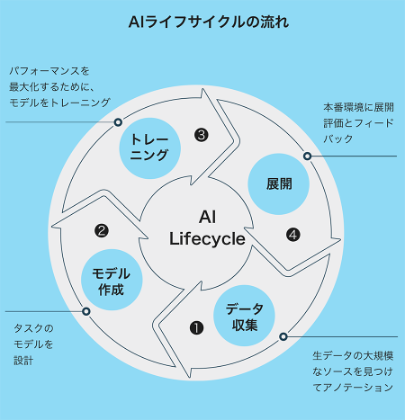 AIにおけるデータプラットフォームには、AIデータの源となる各分野に分散されている大量かつ多岐にわたるデータドリブンのためのデータを効率的かつ安全に収集、保存、管理することが求められ、これらのAI学習データを適切に保存管理することができる AIデータマネジメントが重要です。AIの成功は、AIアルゴリズムのトレーニングに使用するトレーニングデータの品質と、AIライフサイクルによるメンテナンスが重要な鍵となります。