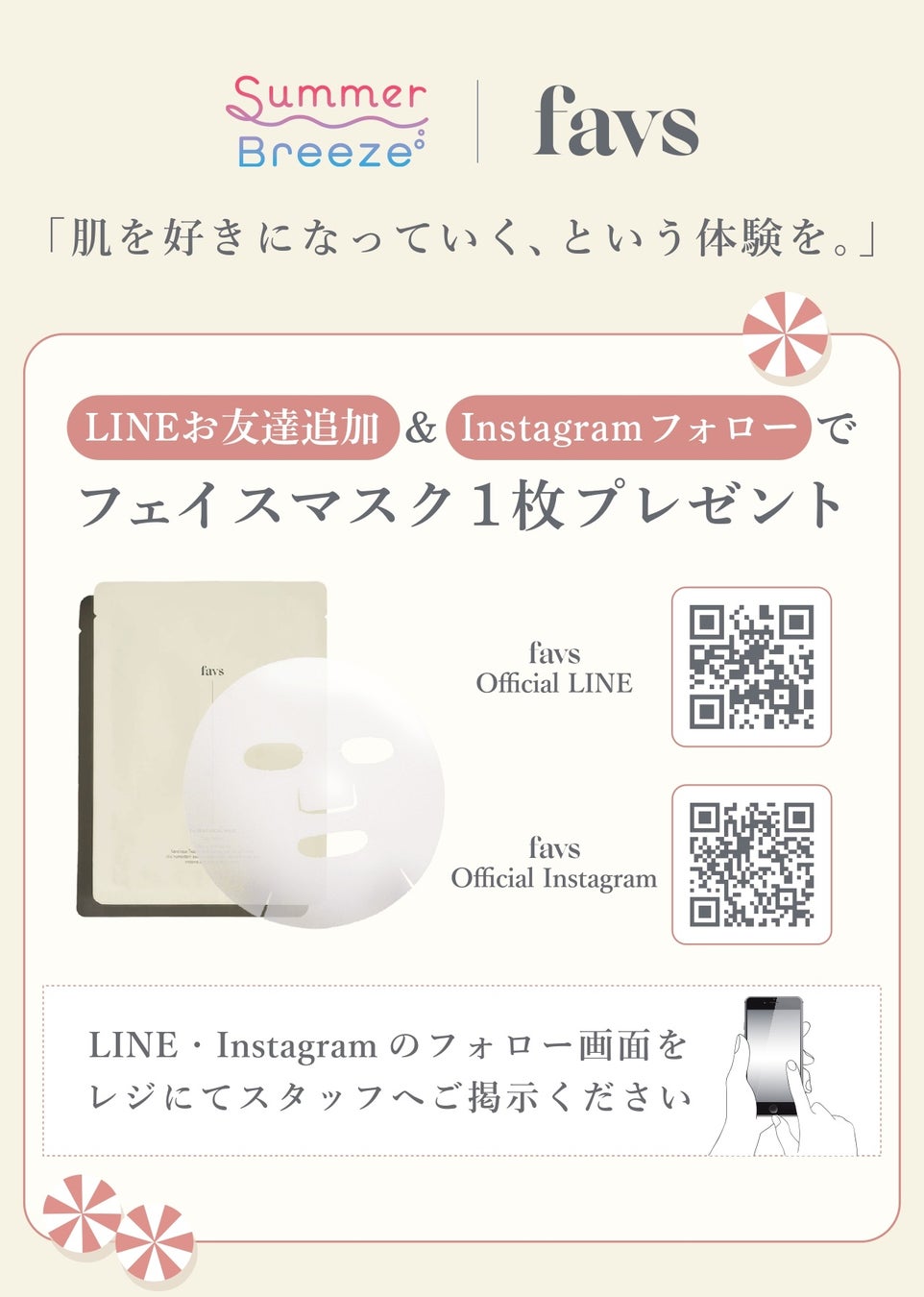 株式会社ダイヤコーポレーション(所在地:東京都新宿区 代表取締役:高野祐一)は、江ノ島海の家(所在地:神奈川県藤沢市片瀬海岸)summer breezeにて山中美智子によるスキンケアブランド〈favs〉のサンプリングイベントを2024年7月1日(月)から期間限定にて開催いたします。favsの大人気商品、≪CALMING FACIAL MASK≫を1枚プレゼント!