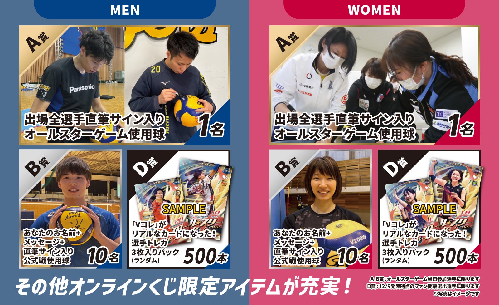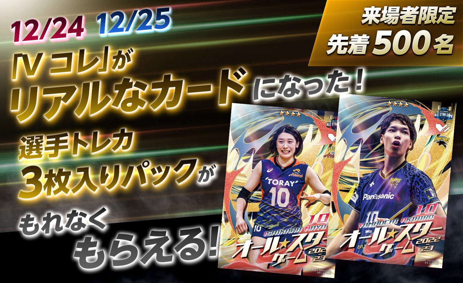 非売品の「Vコレ」選手トレカパック(3枚入り)は、オンラインくじの景品として入手できるほか、12/24、25のオールスターゲーム会場内の特設ブースにて、両日とも先着500名様にもれなくプレゼントいたします。女子選手カードは全14種、男子選手カードは全13種となっております。オールスターゲームご来場予定のお客様はぜひ、特設ブースにて「Vコレ」選手トレカパックをお受け取りくださいませ。