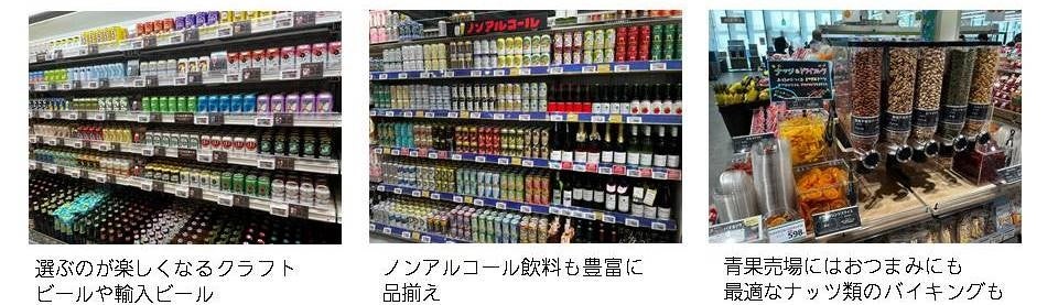 クラフトビール、輸入ビール、およびビール風のノンアルコールビールを多彩に揃え、さらにそれに合うおつまみも販売いたします。お客様に選ぶ楽しみを提供するため、バラエティ豊富にご用意しております。また、女性や若い方向けには、甘いお酒や低アルコール度数の商品、 見た目にも美しい商品を手軽にお試しいただけるよう、小容量の商品も充実させております。