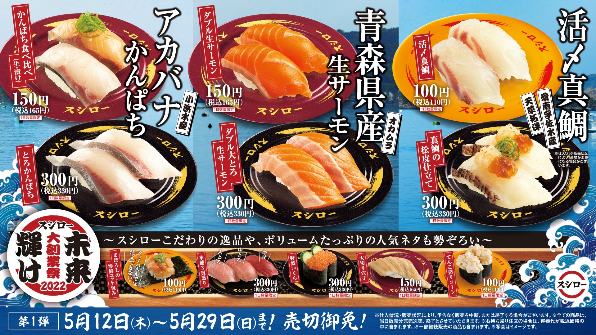 スシローは、『うまいすしを、腹一杯。うまいすしで、心も一杯。』を企業理念に掲げ、素材や店内調理にこだわった“うまいすし”を提供しています。5月12日(木)からはスシローの創業を記念し、年に一度の『スシロー大創業祭』を開始いたします。今年は『未来輝け!大創業祭』をテーマに掲げ、回転すし業界のリーディングカンパニーとして“食の未来への還元”を体現すべく、第一弾は“輝け、日本のうまい魚。”、第二弾は“輝け、日本のすごい技。”、第三弾は“輝け、子ども達の笑顔。”をテーマに商品を提供いたします。