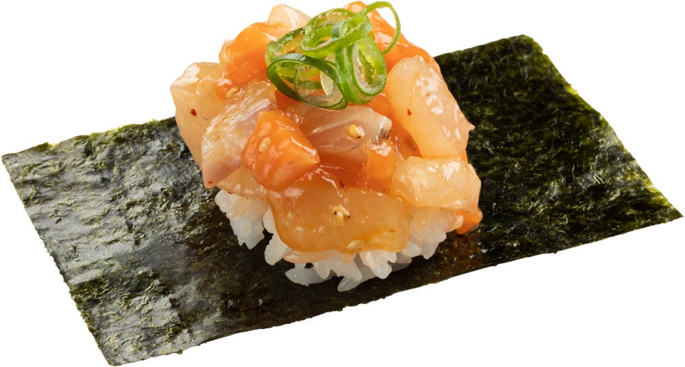 各生産者がこだわり抜いたアカバナかんぱちや生サーモンなどの魚を、スシローオリジナルのユッケたれで和えてたっぷりと盛り付けた「まぼろしの海鮮ユッケ包み」は、ネタの旨みを口の中でダイレクトに感じていただけるよう、あえて包みでご用意しました。店内調理にこだわるスシローの特別な新メニューは、タッチパネルでは注文ができない、レーン限定でお楽しみいただける裏メニューです。