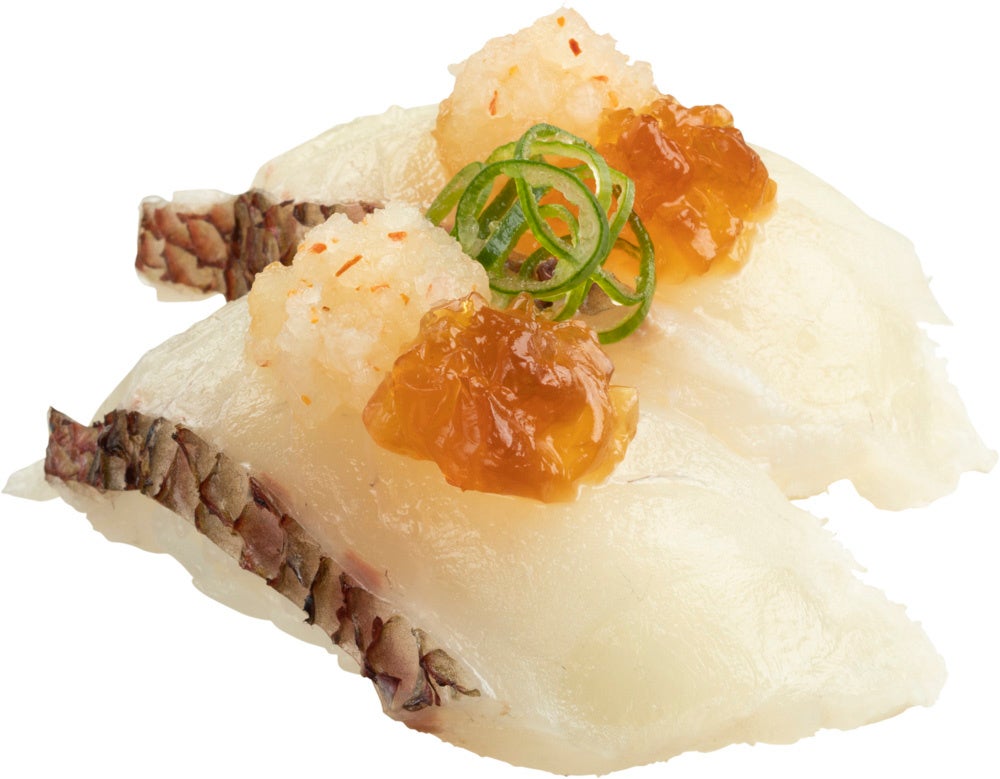 鮮度の良さにとことんこだわった真鯛は、熊本県の“拓洋”と、愛媛県の“宇佐水産”のネタをそれぞれ異なるエリアでご提供いたします。“拓洋”の真鯛は、鹿児島県や熊本県の工大で美しい漁場で育ち、より鮮度の良い状態で提供できるよう最適なルートで店舗に届きます。“宇佐水産”の真鯛は愛媛県の黒潮が流れ込む良質な漁場で育ち、鮮度抜群の状態で店舗に届きます。どちらもよく引き締まった身と、鯛ならではの歯ごたえのある食感が特長です。