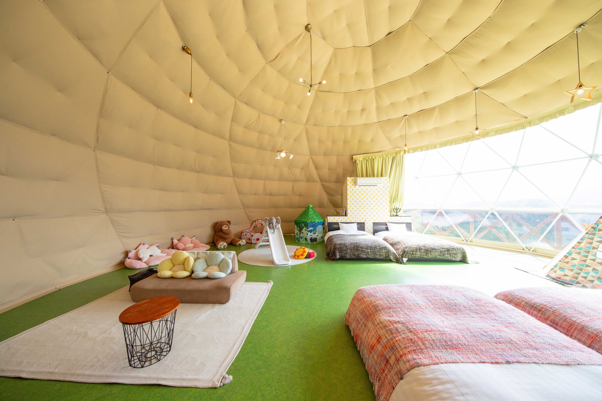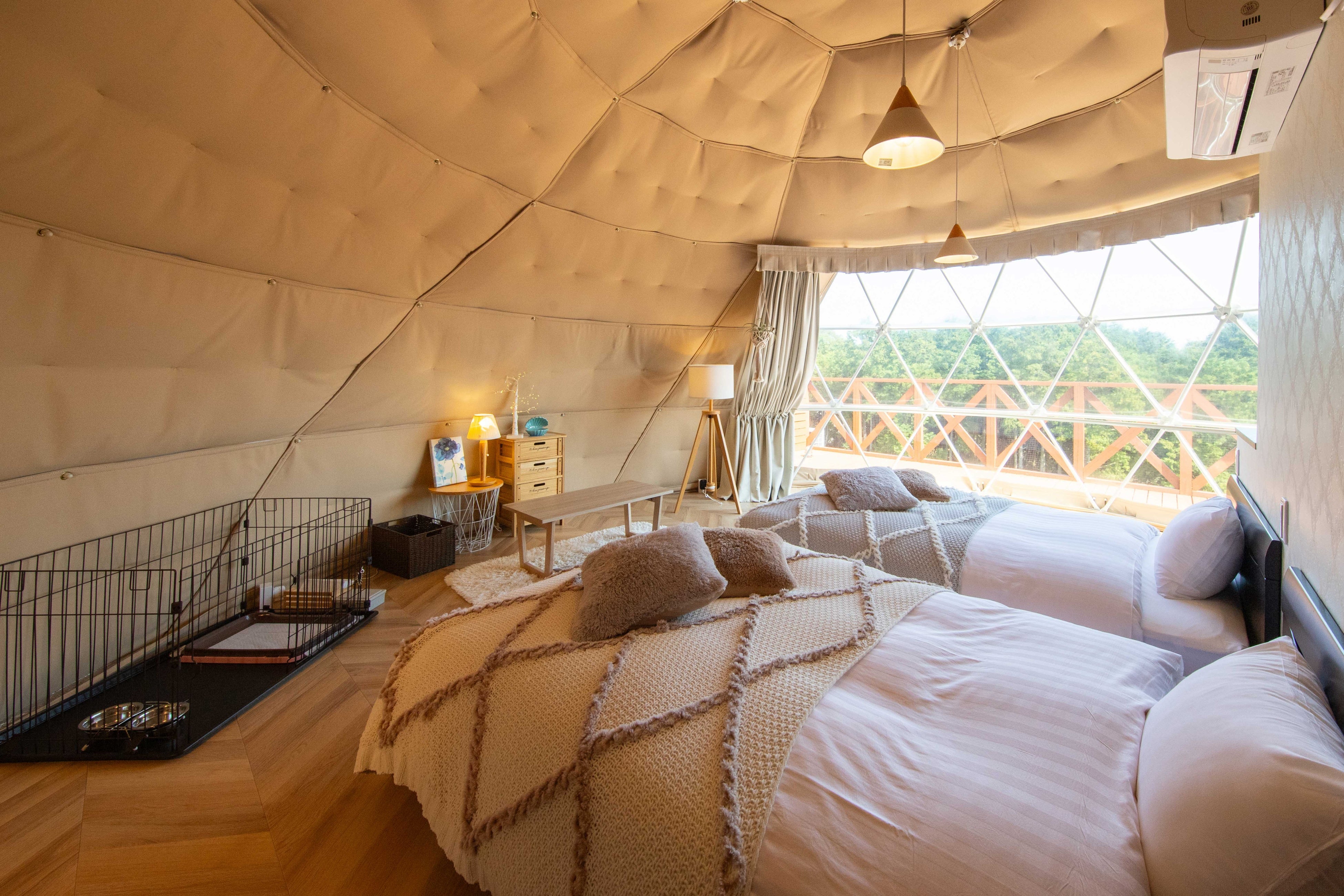 遠く由布岳や鶴見岳の景観、別府市内の湯けむりが立ち上る情景を望む敷地内に配置した14棟のグランピングテント。いずれのテントも温泉風呂や食事スペース、個別トイレといった専用設備を有する高規格仕様。