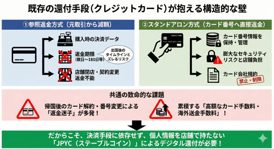 店舗のセキュリティ・オペレーション限界:還付のために店頭でクレジットカード番号や口座情報等を取得・管理することは、個人情報漏洩や内部不正のリスクを伴い、現場のオペレーションに多大な負荷をかけます。