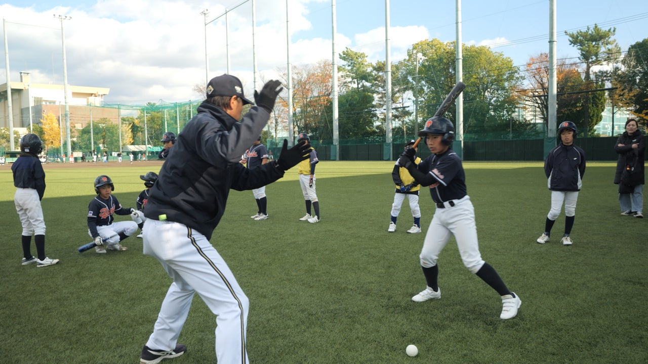 今回ご指導頂いたのは、元阪神タイガース選手・監督である真弓明信氏に加え元オリックス・バファローズのT-岡田氏、オリックス・バファローズの鈴木博志選手、石川亮選手、その他オリックスのOB コーチ陣3 名が直接野球少年少女に指導してくれました。
