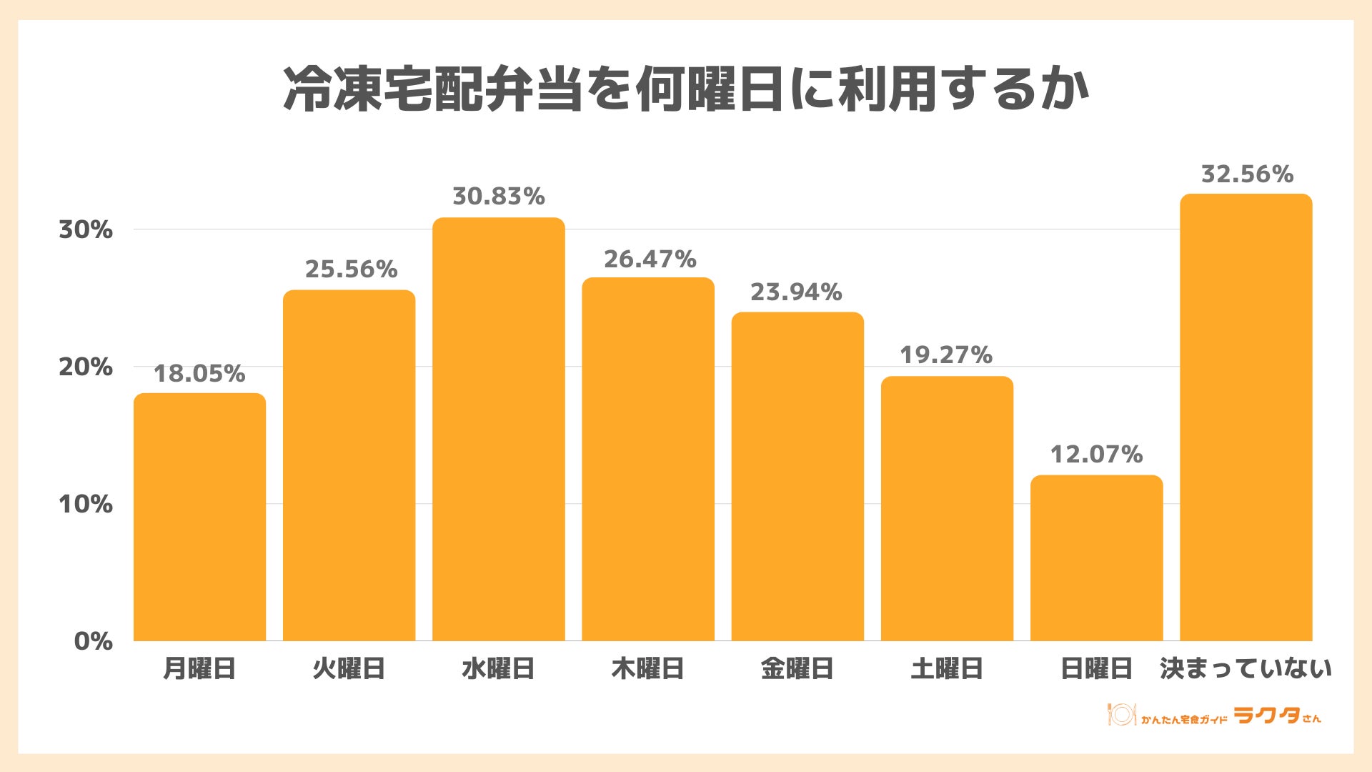 - 1週間のうち「水曜日」に冷凍弁当を利用する人が多い。