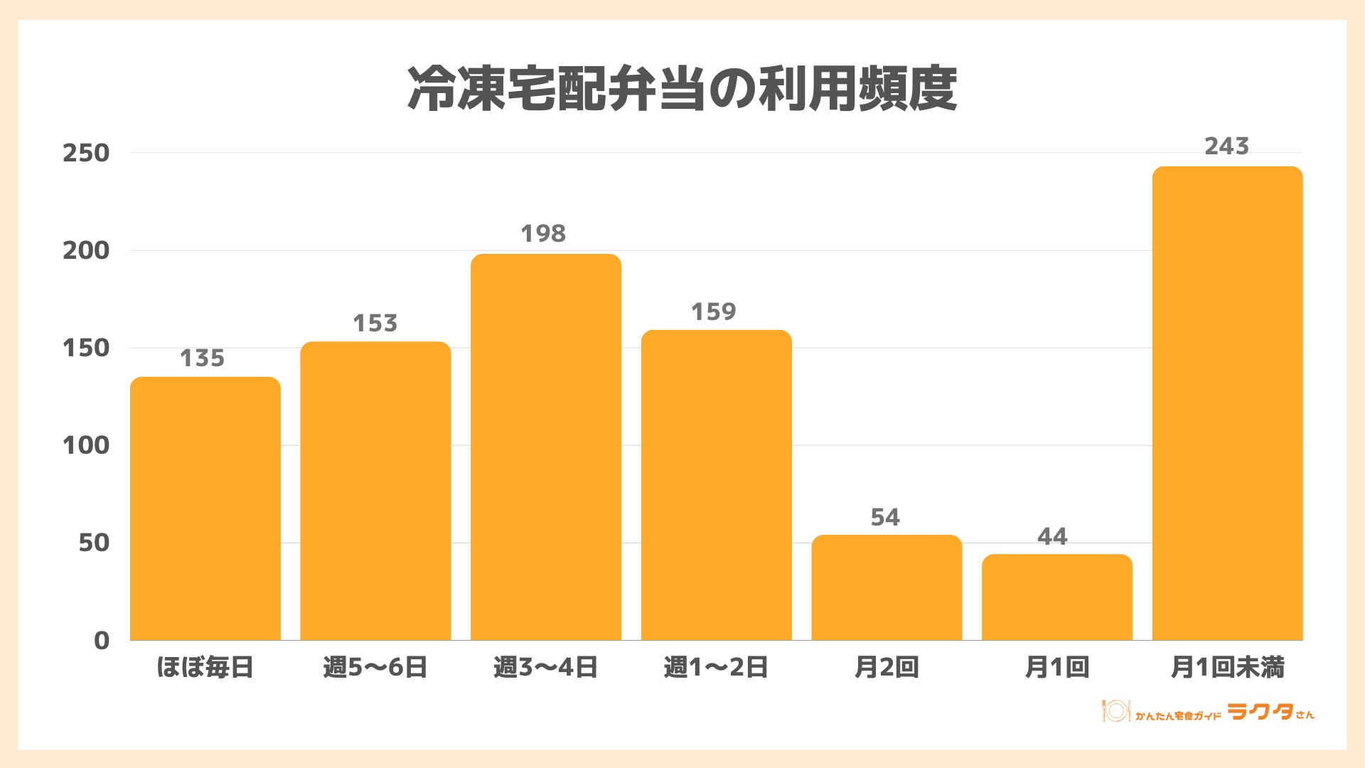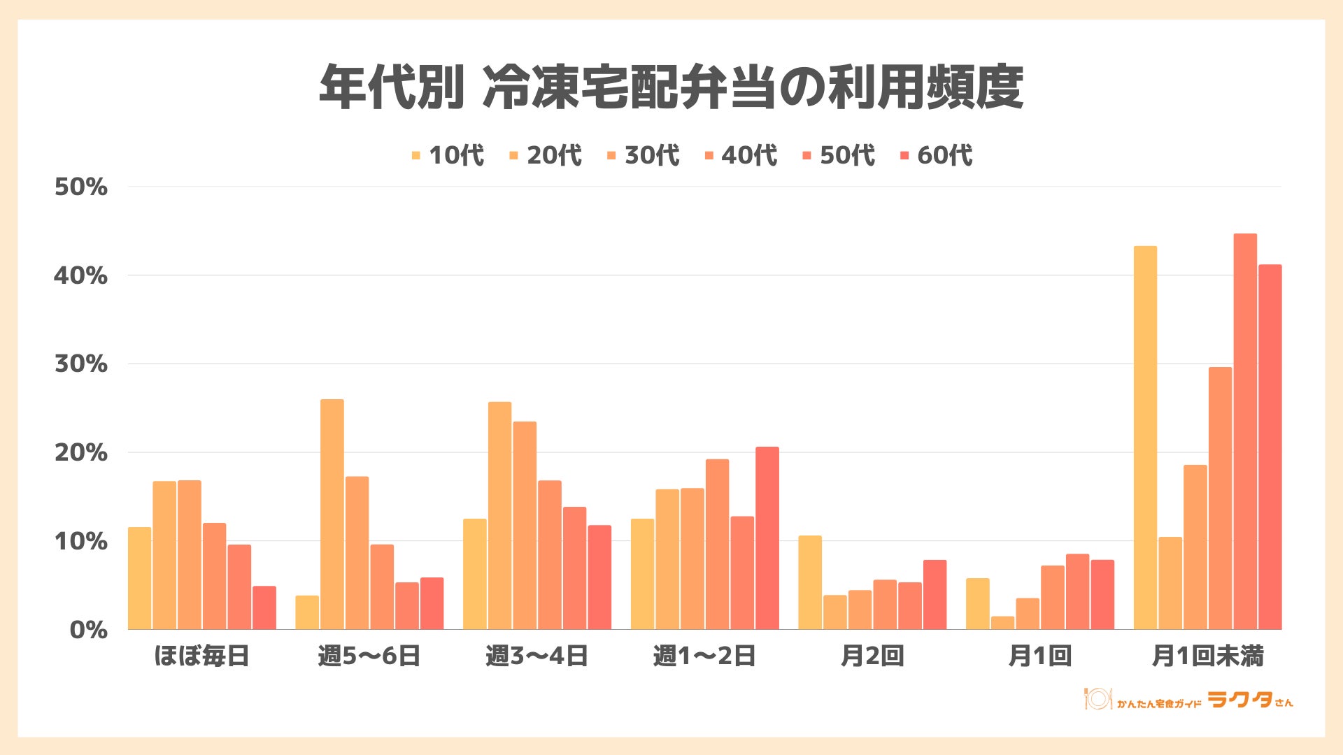 ナイル株式会社(本社:東京都品川区、 代表取締役社長:高橋飛翔、 以下ナイル)が運営する「かんたん宅食ガイド ラクタさん」にて、冷凍宅配弁当サービスを利用している・利用したことのある10代~60代男女986人を対象に、2023年3月17日~3月24日の期間で、冷凍弁当の利用頻度に関するアンケートを実施しました。