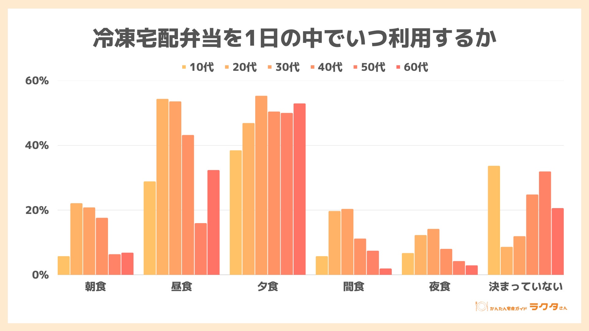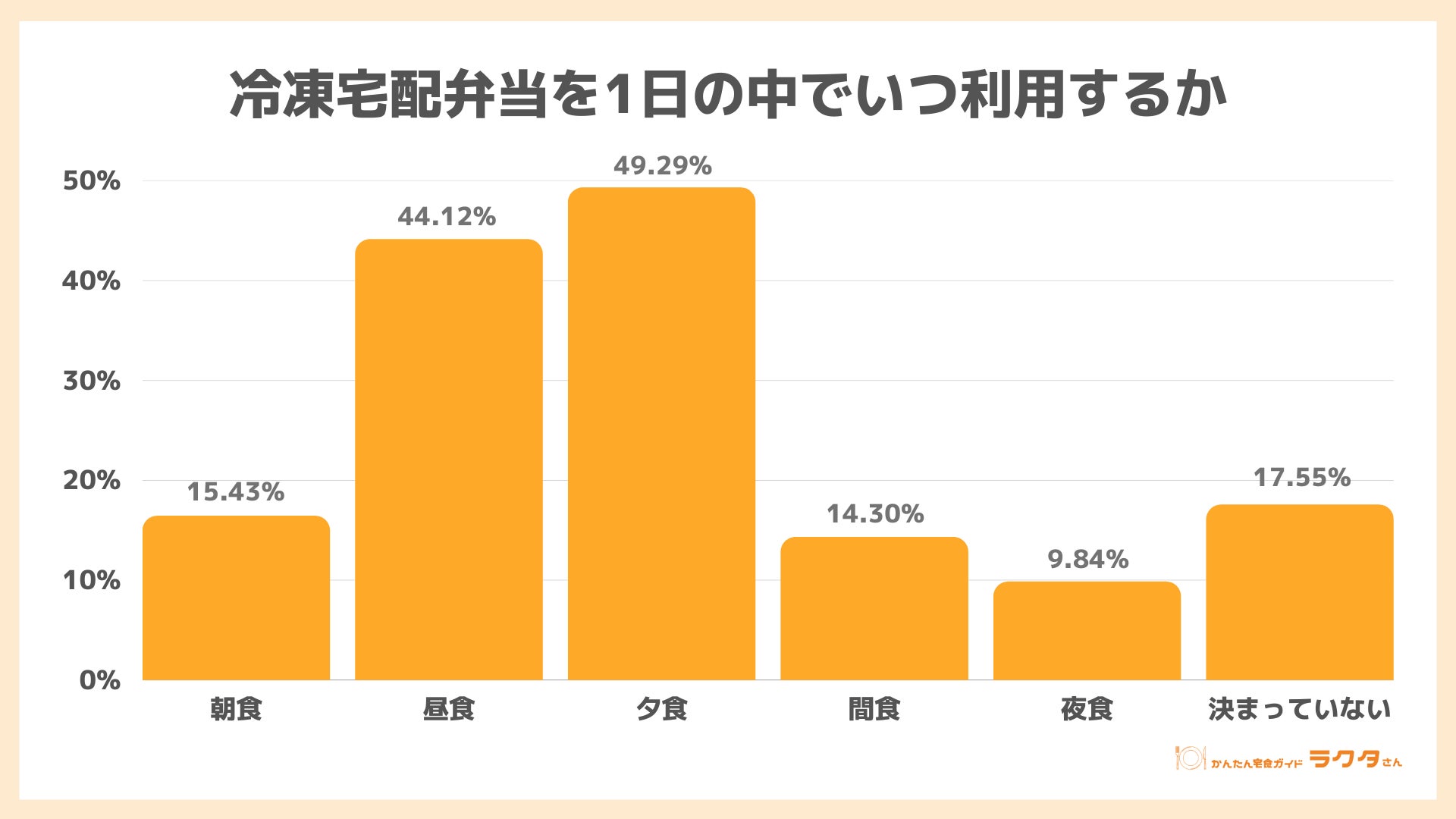- 半数近くが夕食または昼食で冷凍弁当を利用。