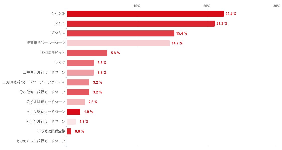 消費者金融カードローンのアイフルが22.4%で最も多く、アコム(21.2%)、プロミス(15.4%)と続いた。