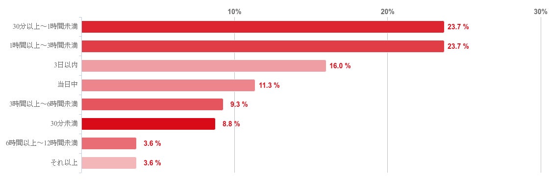 「1ヶ月以上3ヶ月未満」が23.6%で最も多かったが、「3ヶ月以上6ヶ月未満」との回答も22.7%とこれにせまる結果となった。