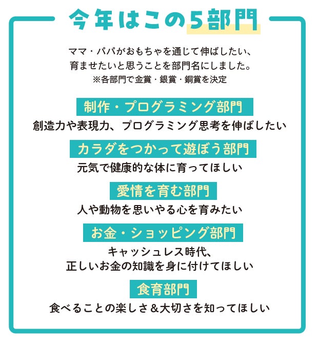 おもちゃは、子どもたちにとって大好きな遊び道具なだけでなく、心身の発達・成長に大きく影響を与えるもの。そこで、今回はママ・パパ目線で、「おもちゃを通じて伸ばしたい、育ませたい」と思うことをそのまま部門名に、全5部門で実施します。