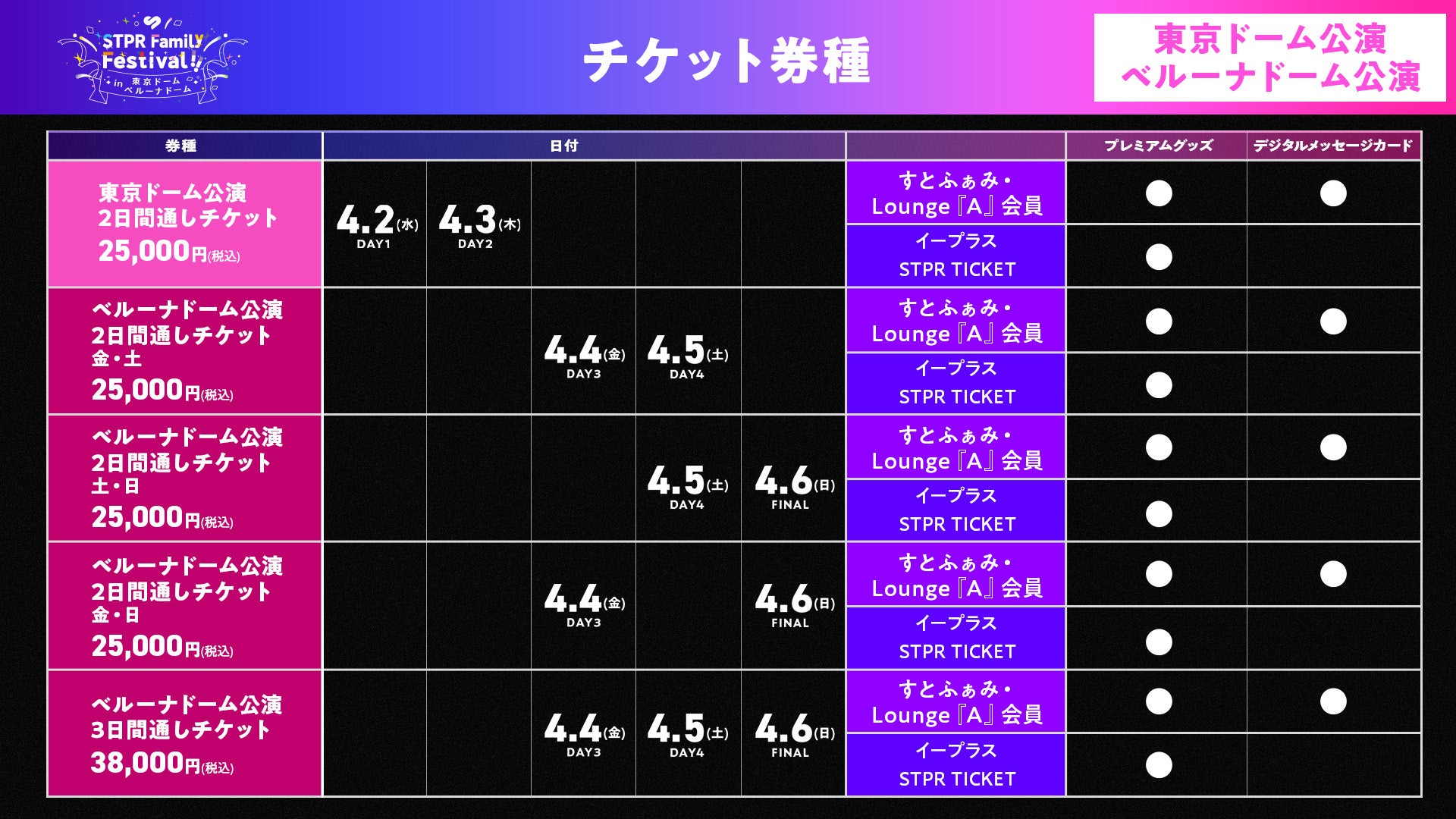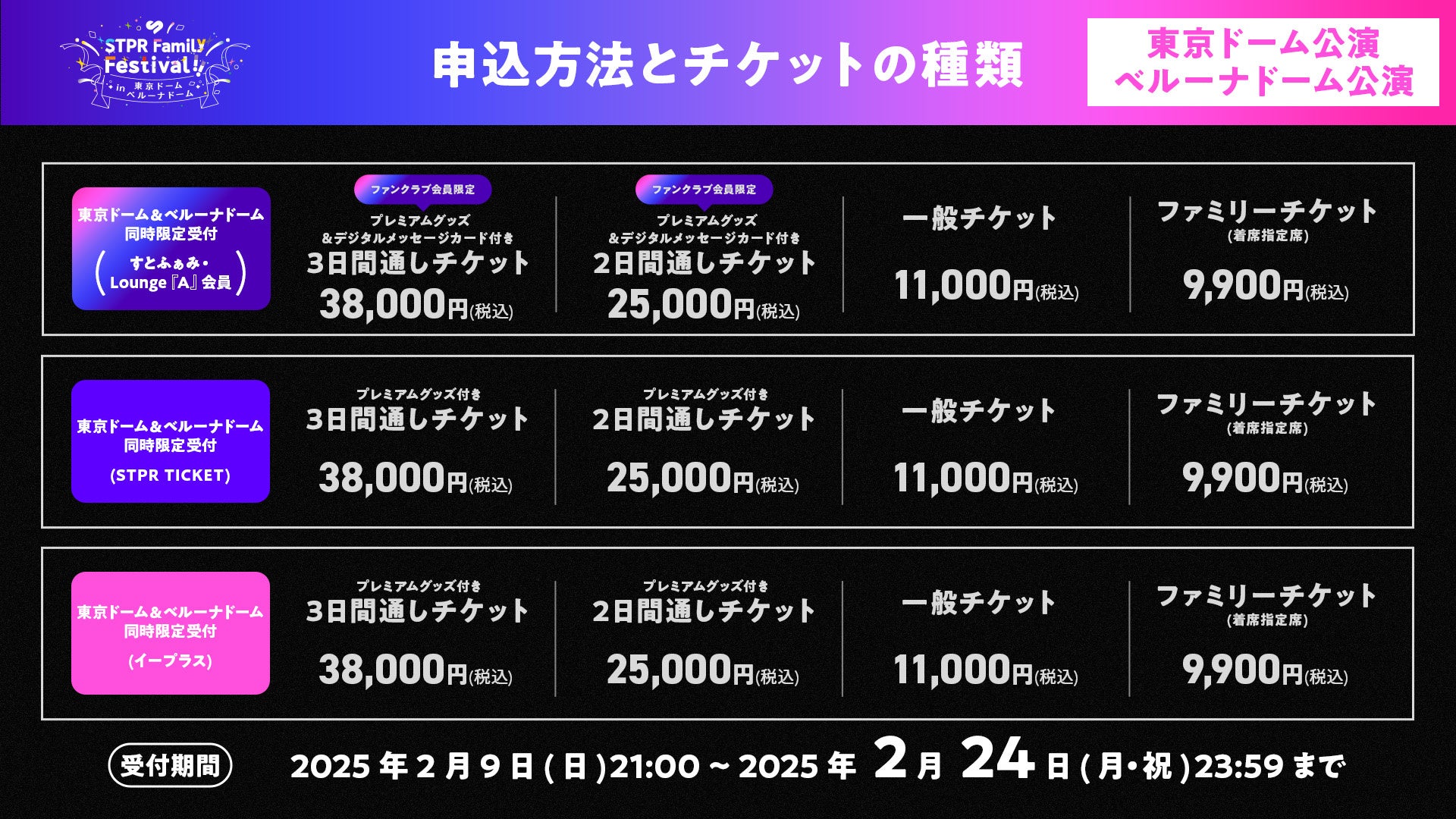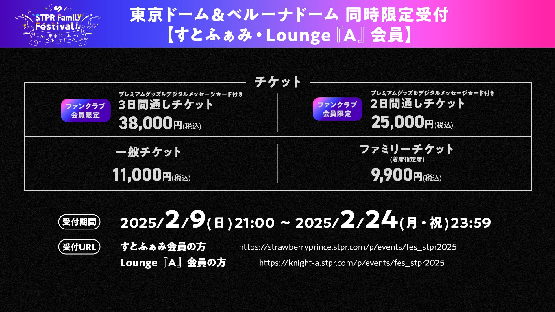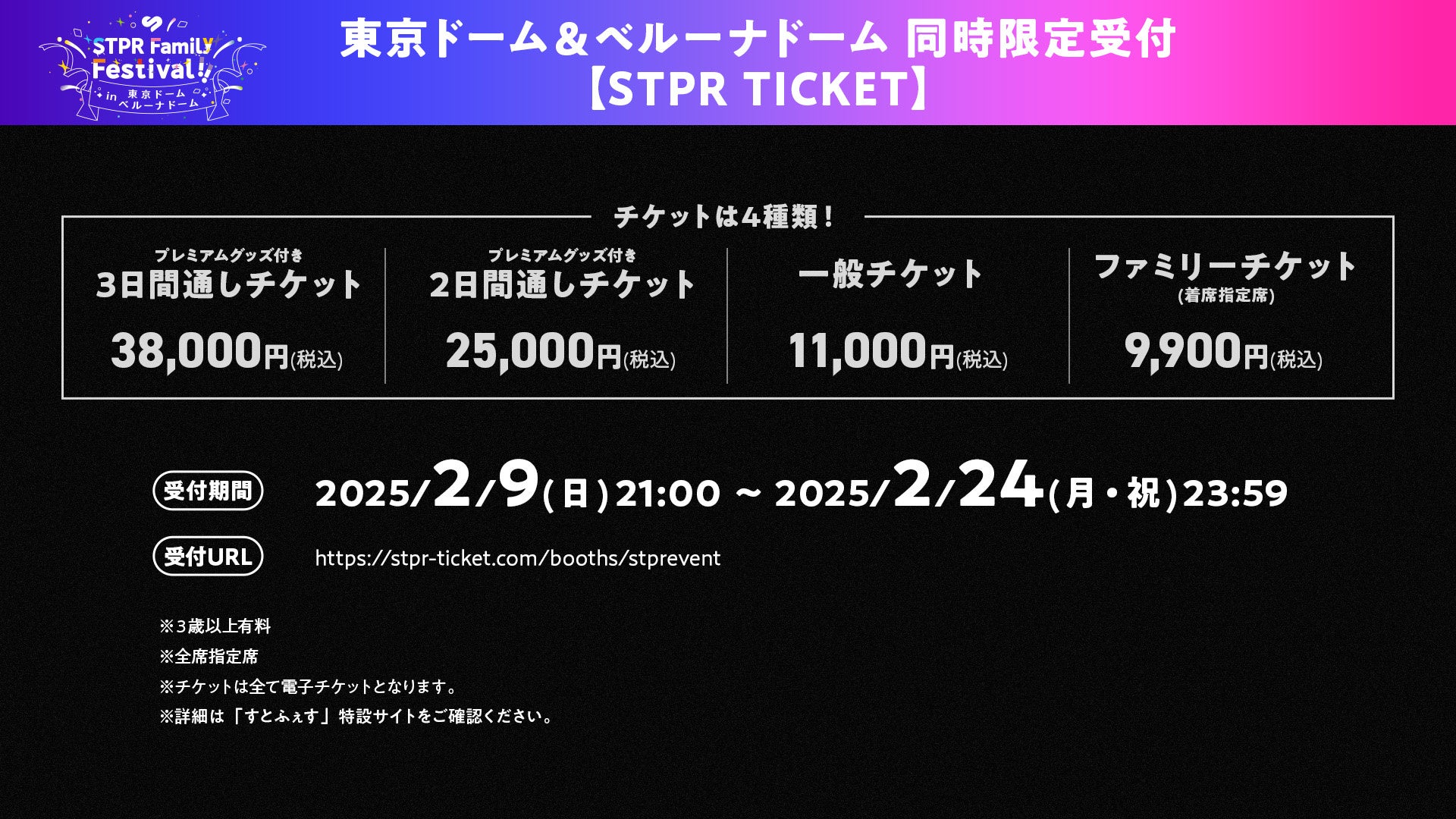 株式会社STPR (本社:東京都渋谷区 代表:柏原 真人、以下STPR)は、「すとぷり」「Knight A - 騎士A -」「AMPTAKxCOLORS」「めておら - Meteorites -」など、所属のクリエイターが集結する大型ライブフェス『STPR Family Festival!!』の出演者・公演概要・プレミアムグッズなどの情報を公開するとともに、オフィシャルチケットの東京ドーム&ベルーナドーム同時限定受付を開始したことをお知らせいたします。東京ドーム&ベルーナドーム同時限定受付は、2025年2月9日(日) 21:00より公式ファンクラブ、STPR TICKET、イープラスにてお申込みを受け付けております。