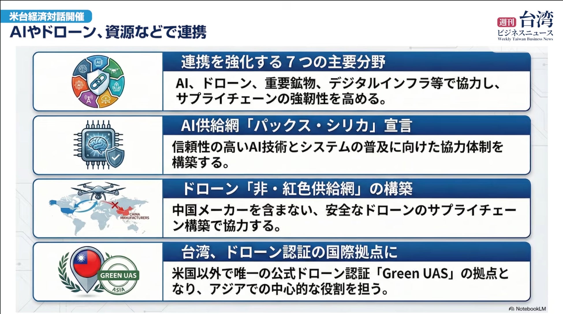 ・ドローン認証拠点:台湾の工業技術研究院(ITRI)が、米国のドローン認証制度「Green UAS」の評価機関として提携。台湾が米国以外で唯一の認証拠点となり、「非・紅色供給網(ノン・レッドサプライチェーン)」の構築を加速させます。
