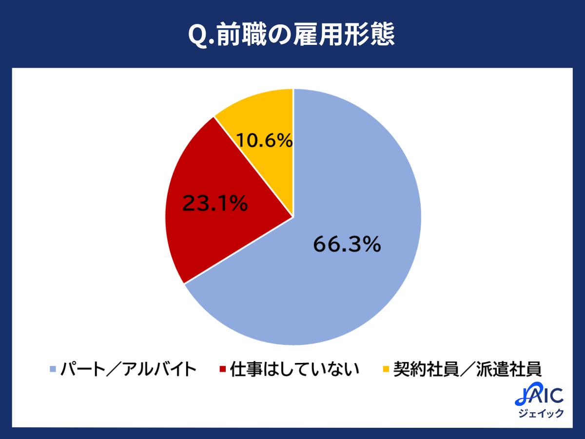 「前職の雇用形態を教えてください」と質問したところ、「パート/アルバイト」が66.3%、「仕事はしていない」が23.1%、「契約社員/派遣社員」が10.6%となりました。