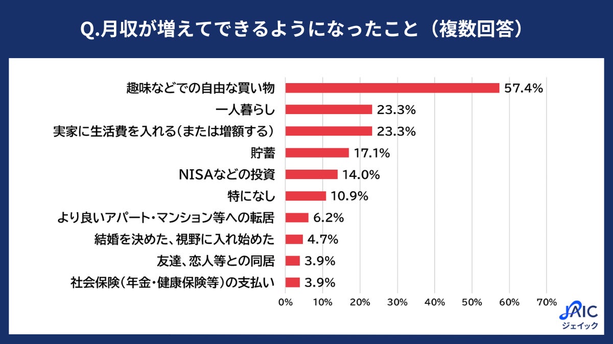 ■月収が増えてできるようになったこと:1位「趣味などでの自由な買い物」(57.4%)