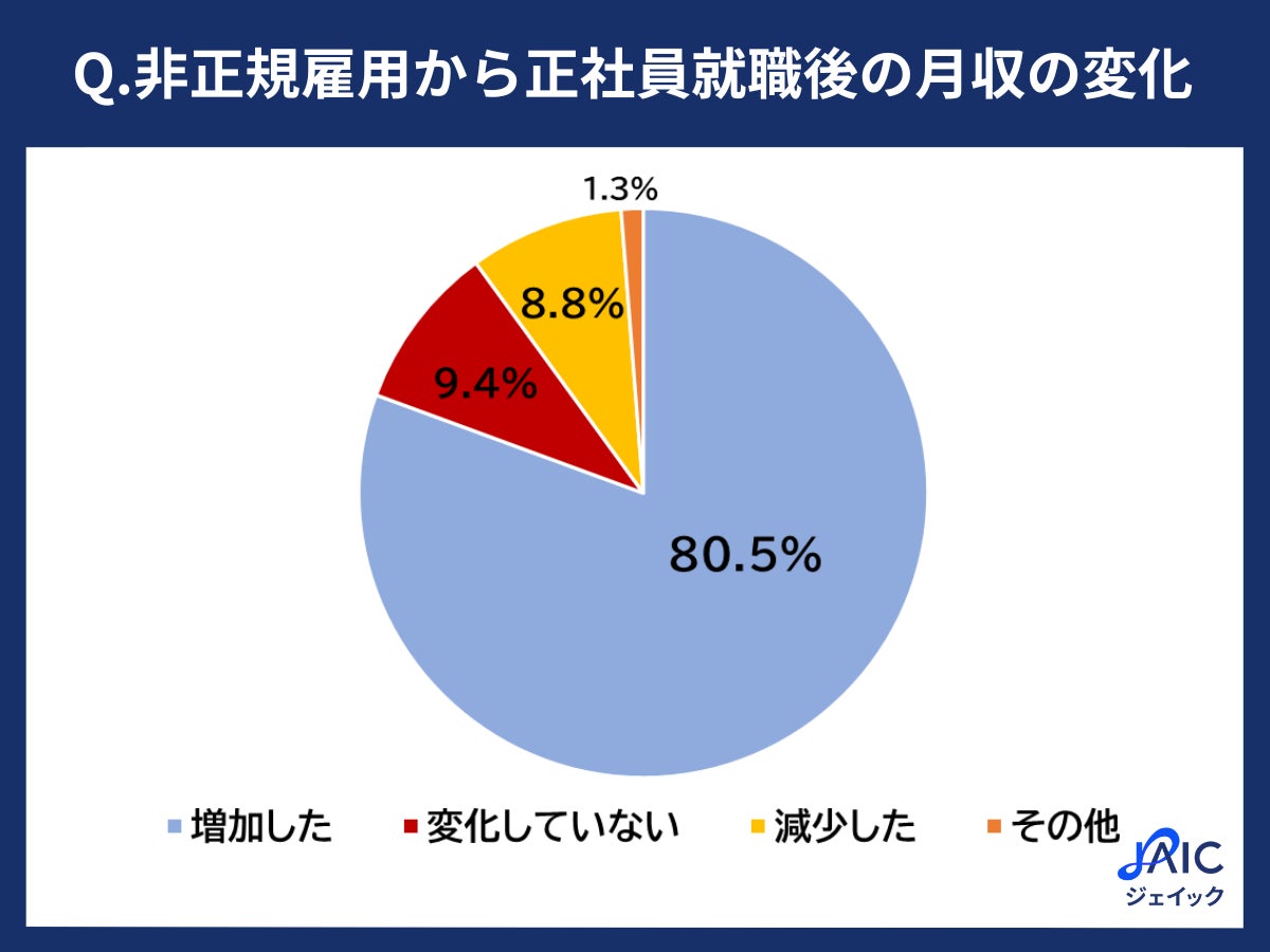 「正社員として就職して、月収は増加しましたか?」と質問したところ、「増加した」が80.5%、「変化していない」が9.4%、「減少した」が8.8%、「その他」が1.3%となりました。