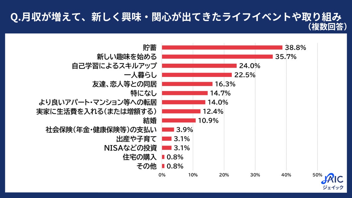 正社員就職後の月収が「増加した」と回答した方に、「月収が増えて、新しく興味・関心が出てきたライフイベントや取り組みはありますか?当てはまるものをすべて選択してください」と質問したところ、「貯蓄」が38.8%、「新しい趣味を始める」が35.7%、「自己学習によるスキルアップ」が24.0%、「一人暮らし」が22.5%、「友達、恋人等との同居」が16.3%、「特になし」が14.7%、「より良いアパート・マンション等への転居」が14.0%、「実家に生活費を入れる(または増額する)」12.4%、「結婚」が10.9%、「社会保険(年金・健康保険等)の支払い」が3.9%、「出産や子育て」「NISAなどの投資」が同ポイントで3.1%、「住宅の購入」「その他」が同ポイントで0.8%となりました。