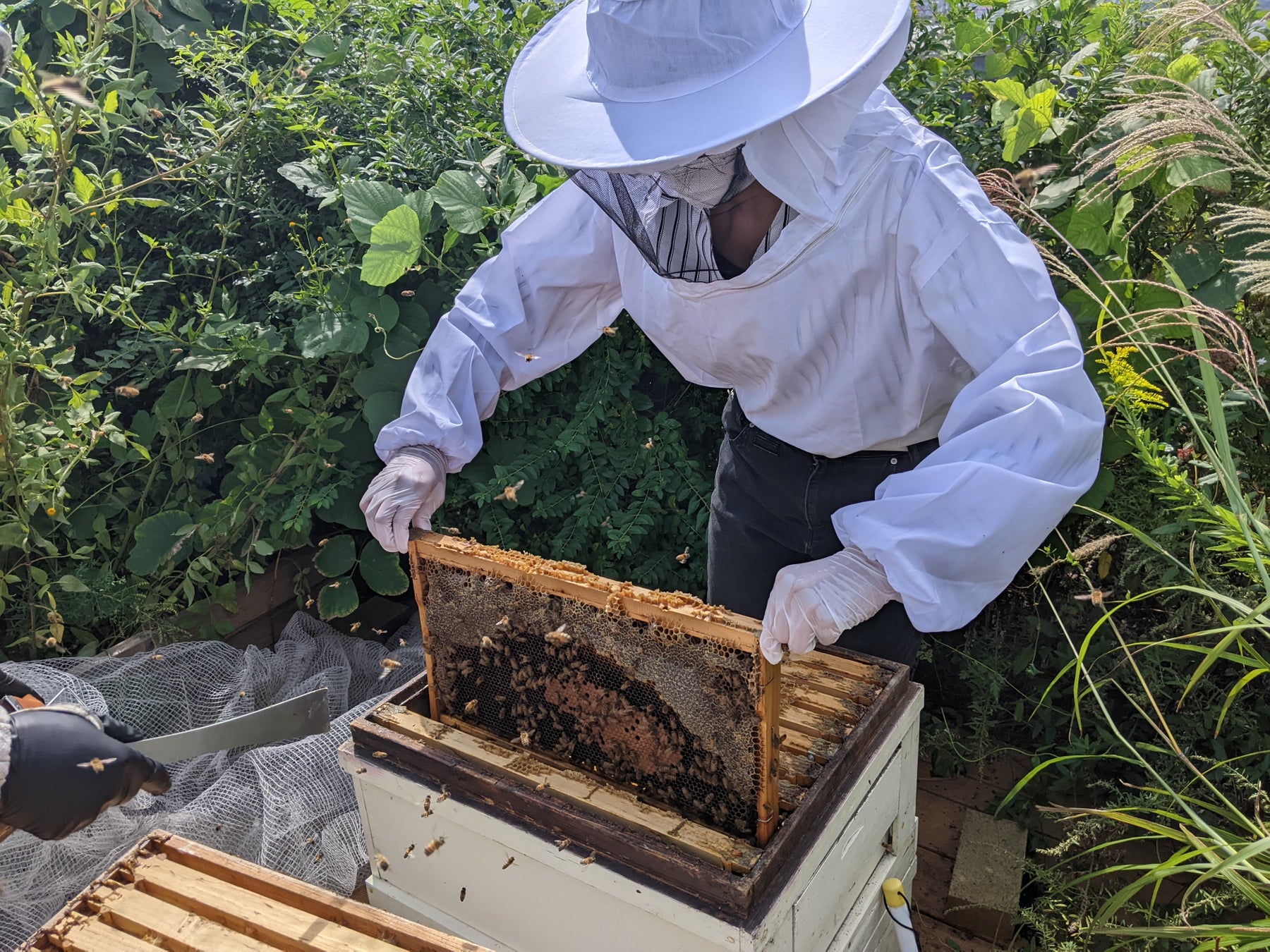 現在は学生6名がチームの中心となって週1回の巣箱点検や採蜜を継続的に行い、今年度は約40kgのはちみつを採取しました。