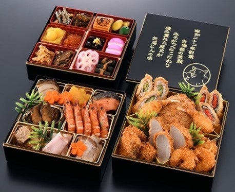 昭和二十二年創業。お客様の笑顔とみそかつへのこだわりを積み重ねた歴史が矢場とんの味。ふっくらと柔らかい南九州産ひれとんかつや、お祝いの場にふさわしいずわいがに甲羅フライなどをぎっしりと詰めたお重に、一年半熟成させた天然醸造の豆味噌から作る秘伝の味噌だれを活かした変わり種のお重、昔ながらのおせち料理を中心に詰合せたお重との三段で、矢場とんらしさを詰め込んでつくりました。冷凍便にてお届けいたします。