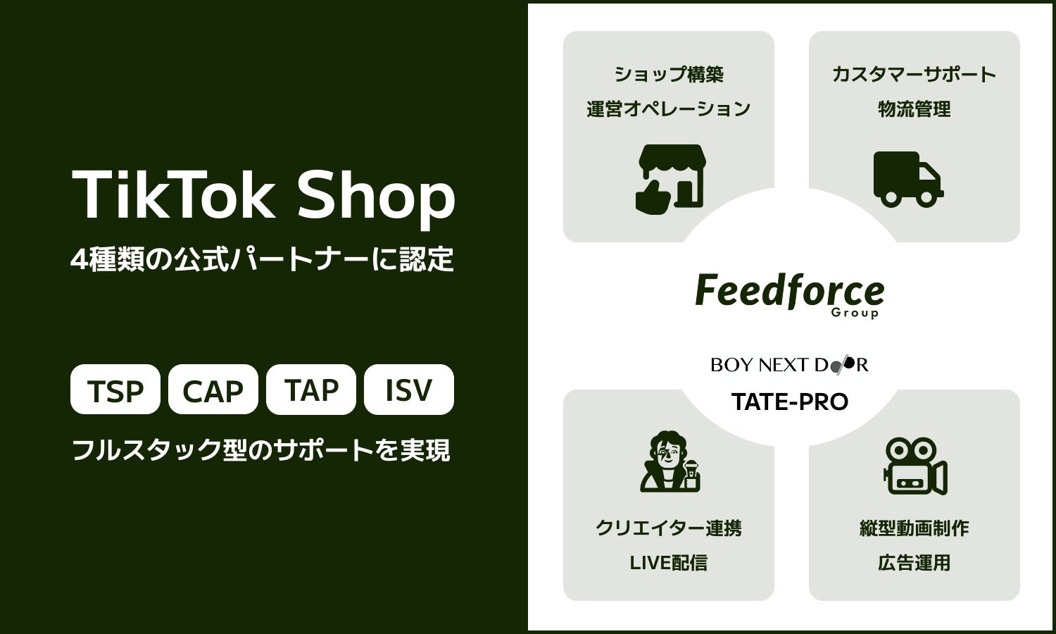 フィードフォースグループ株式会社(本社:東京都港区、代表取締役社長:塚田耕司、以下「フィードフォースグループ」)は、TikTok Shop の公式パートナープログラムにおいて、「TSP(TikTok Shop Partner)」、「CAP(Creator Agency Partner)」、「TAP(TikTok Affiliate Partner)」、そして「ISV(Independent Software Vendor)」の4つの種類の公式パートナーに認定されたことをお知らせいたします。