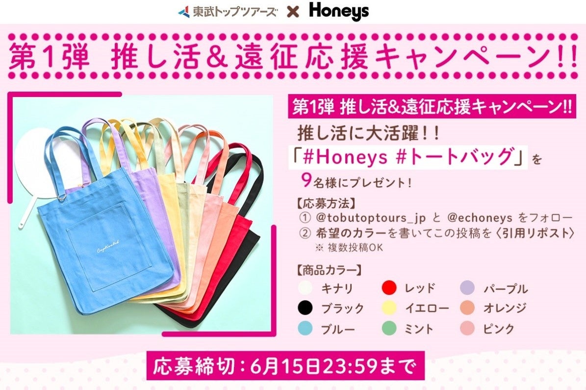 また、公式Xの「推し活&遠征応援キャンペーン」は、多彩な推し活グッズを取り揃えるブランド「Honeys」とタイアップして、推しカラーが見つかる豊富なカラーバリエーションを取り揃える人気商品から、第1弾の6月2日(月) ~ 6月15日(日)では「トートバッグ」を、第2弾の6月16日(月) ~6月30日(月)では「横型ぬいぐるみポーチ」を抽選でプレゼントいたします。ぜひ各キャンペーンへご参加ください!