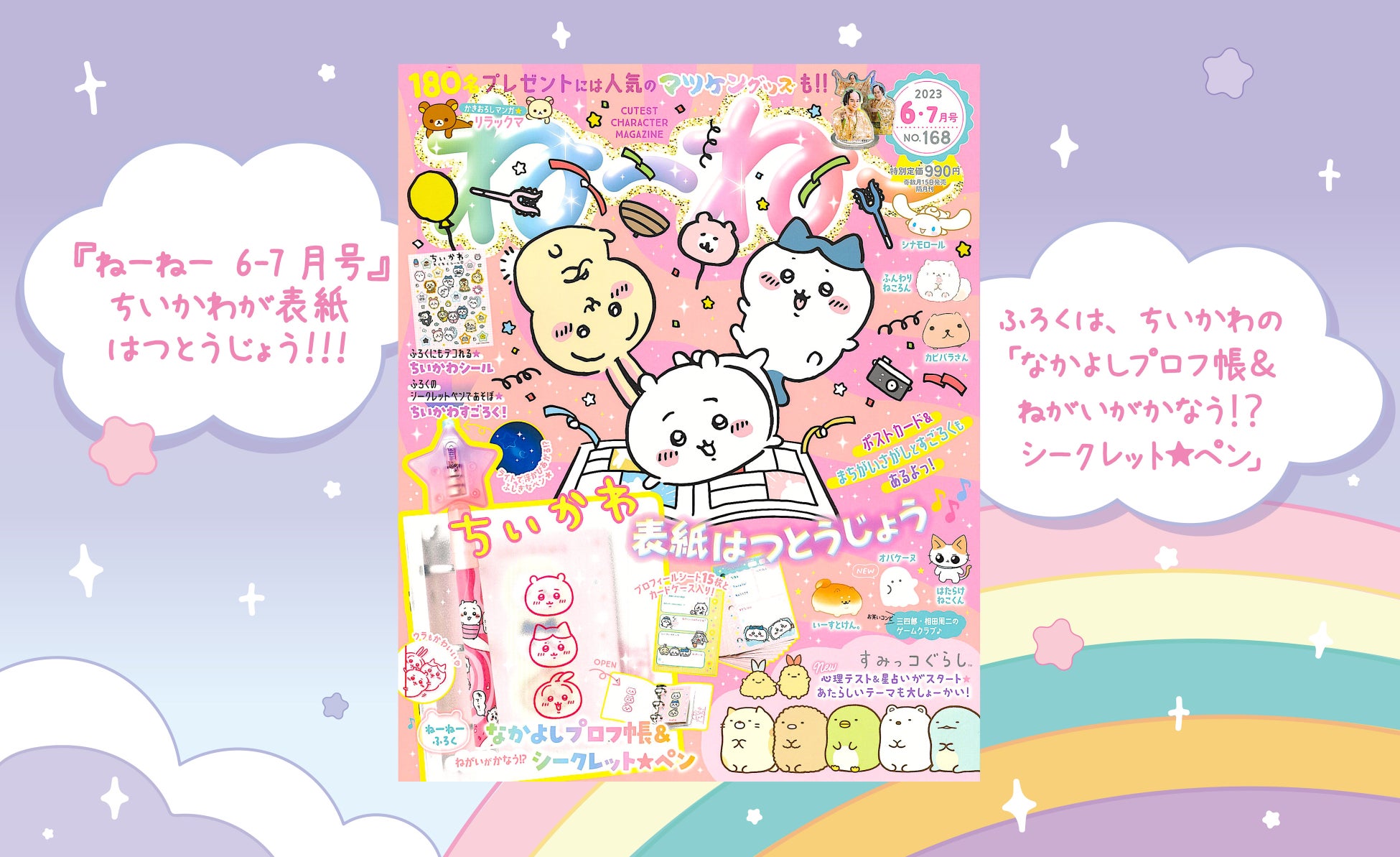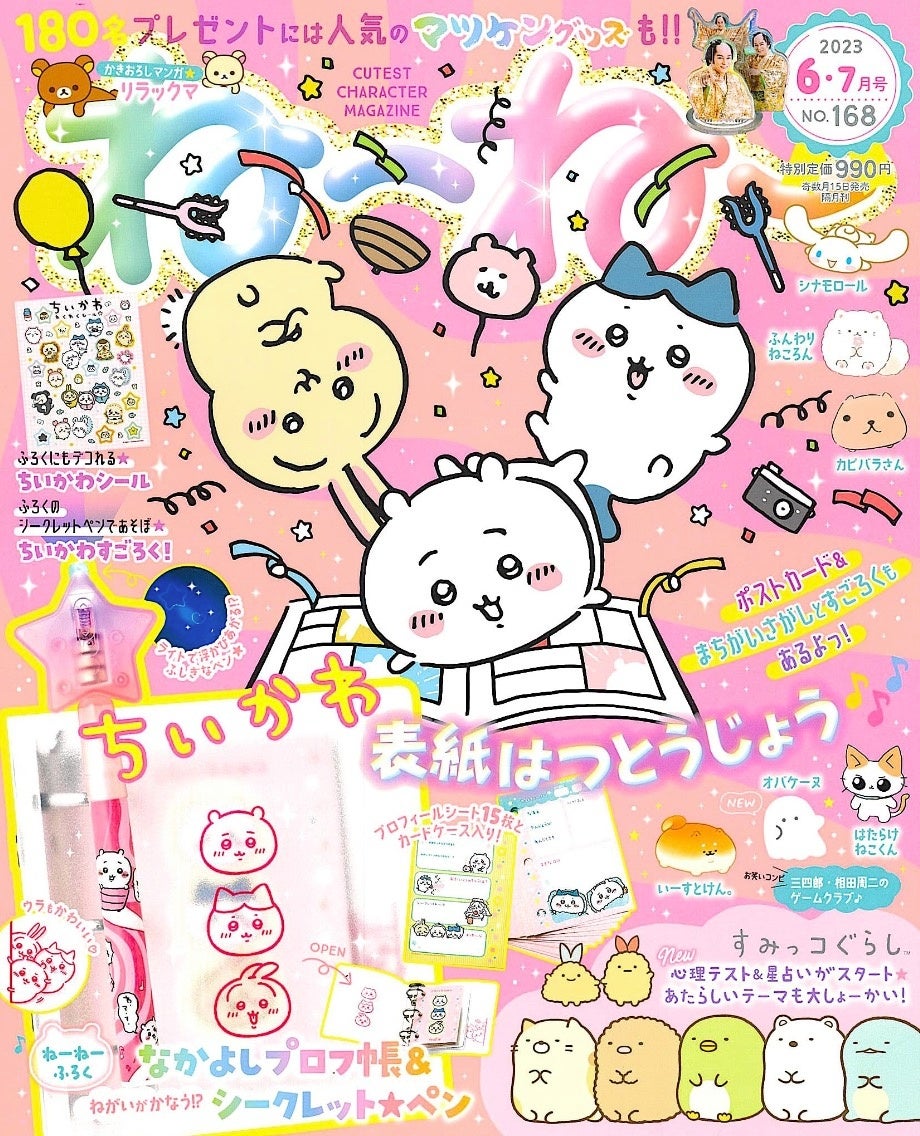『ねーねー 6-7月号』発売! 表紙に「ちいかわ」初登場!! ふろくは「ちいかわ」の「なかよしプロフ帳&ねがいがかなう⁉シークレット★ペン」☆ 「すみっコぐらし占い」と「オバケーヌ」も新連載スタート♪