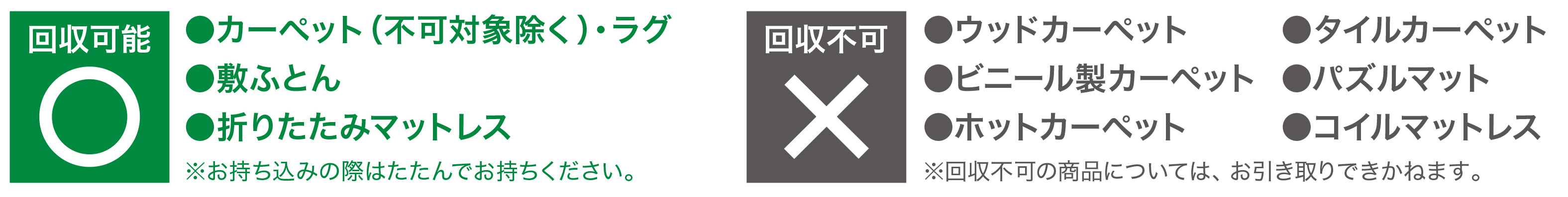 上記の再資源化の仕組みを活かすとともに、今後、より多くのお客様の困りごとを解決するための全国展開を見据え、この度、対象店舗を拡大し「カーペット・敷ふとんリサイクル回収」の取組みを、期間限定で実施することを決定いたしました。カーペット・敷ふとんの処分や、お買い替えをご検討中のお客様は、是⾮この機会に、本取組みにご参加ください。