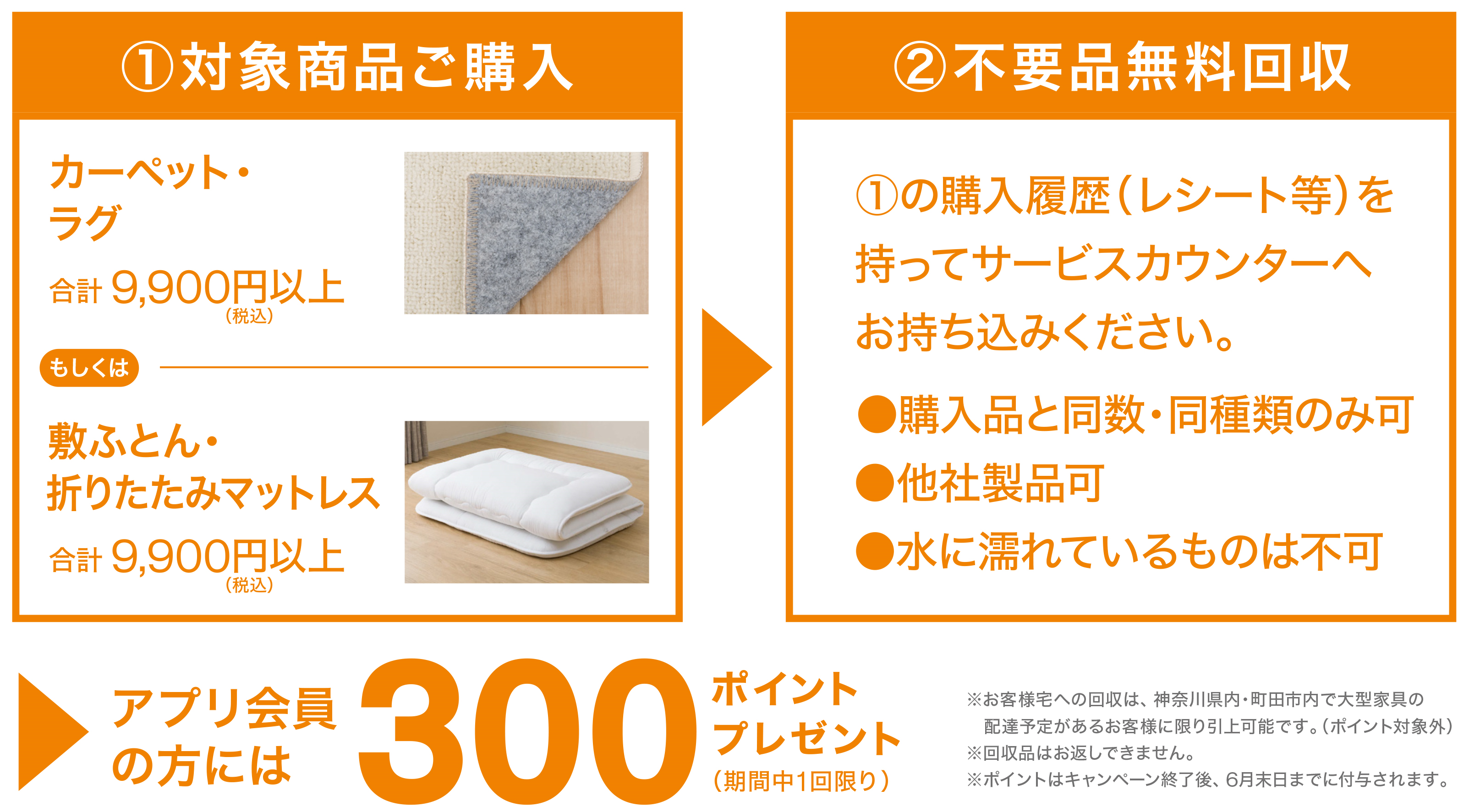 ※お客様宅への回収は、神奈川県内・町田市内で大型家具の配達予定があるお客様に限り引上可能です。(ポイント対象外)