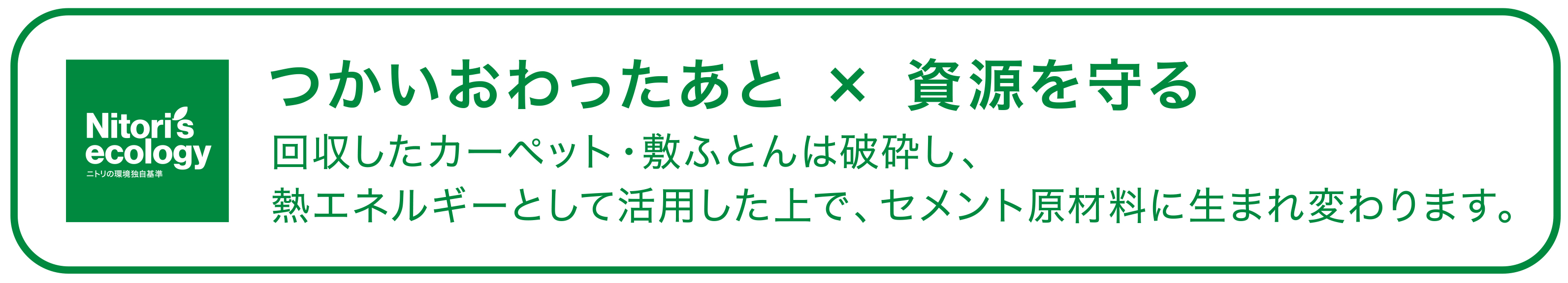 お客様がご愛⽤した品を、「ごみとして捨てる」のではなく、ニトリにお持ち込みいただくことで、「資源」につなげ、お客様に安⼼してつぎのお買い物を楽しんでいただきたいと考えています。