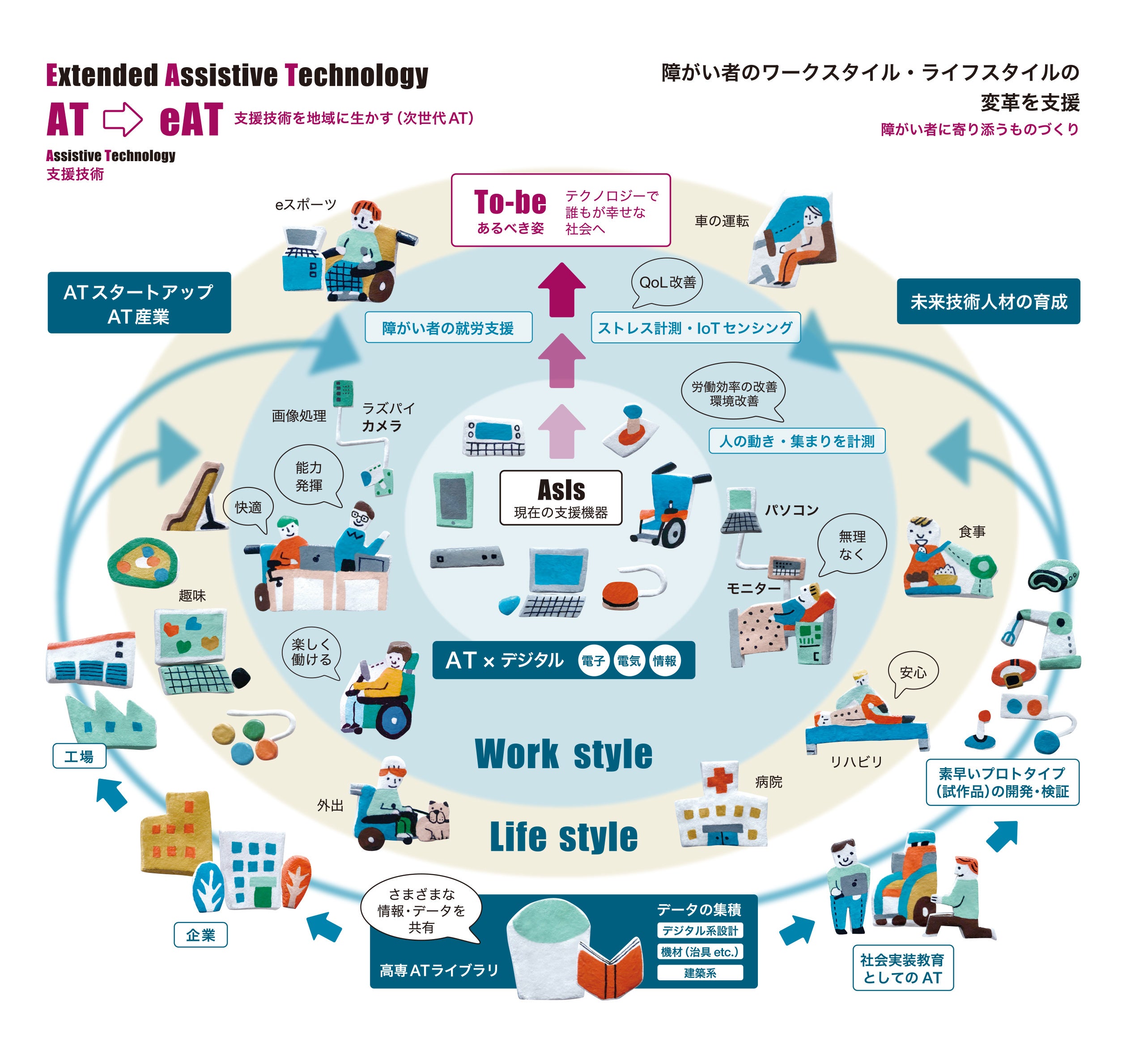 国立高専機構が立ち上げた「Society5.0型未来技術人財」育成事業を構成するプロジェクトの一つです。各高専は、「マテリアル分野」「介護・医工分野」「防災・減災・防疫分野(防疫/エネルギー)」「農林水産分野」「エネルギー・環境分野」の5分野において、分野横断的な課題解決のアプローチができる人材の育成プログラム開発に取り組んでいます。その中の「介護・医工」分野において、「持続可能な地域医療・福祉を支えるeAT-HUB構想(※2)とAT技術者育成による共生社会の実現」への取組が令和2年度に採択されました。本プロジェクトは、中核拠点校である熊本高専と、協力校6校(函館・仙台・長野・富山・徳山・新居浜)を中心に、介護・医工分野での支援技術に関する研究開発及び技術者育成等を行っています。