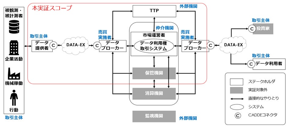 社会におけるデータの流動性を高めるため、データ利用権およびデータを取引の対象とするデータ利用権取引市場システム(注10)を開発し、実証を行いました。データは無体物であるとともに、一般的には法的な財産保護の対象にならないことから、本システムでは、データ利用に関わる権利の条件を標準化したデータ利用権証と対象データを組み合わせて取引します。データ利用権証により、信頼できる第三者機関(TTP)がデータを利用する権利の保証と、取引の関与者それぞれの真正性とデータの完全性を保証することで、安心・安全かつ効率的なデータ取引を支援します。本実証では、DATA-EX(注11)に参加するデータ提供者とデータ利用権取引市場に参加するデータブローカー間における、データ利用権取引市場への上場申請完了後の「データ提供者によるデータ生成」「データブローカーによるデータの受領」に該当するデータ収受にCADDEコネクタを利用し、データセットが適切なタイミングで遅滞なく、かつ真正性、完全性が保証された状態での収受の可否を検証しました。本実証にはPwCコンサルティング合同会社や株式会社MILIZEをはじめとする6社が参加し、実際に利用権証の生成、売買、利用権の行使が可能であることを確認するとともに、実証後のアンケートではすべての回答者が、本システムが現在のデータ取引における課題の解決に資すると回答しました。今後、本実証ではスコープ外とした機能の追加開発やUXの改善、電子署名技術を提供する事業者との連携により、可能性・有用性をさらに向上させ商用化を目指します。