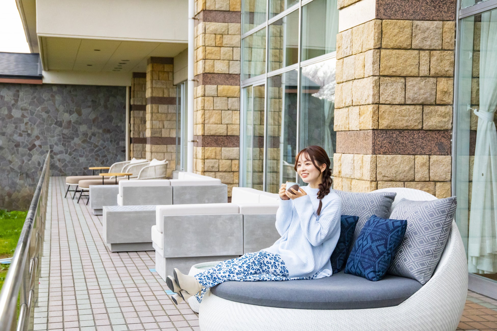 休暇村 越前三国に、日本海を見渡せ、ゆったりとしたソファでのんびりとした時間を過ごしていただけるアウトドアリビング「夕陽と桜のテラス」が登場しました。春には見渡す限りに桜が広がり、今の季節は海や沈む夕陽を眺めながら何も考えずにボーっとしたり、読書をしたり、コーヒーやお酒片手に過ごすのがおすすめ。絶景を望む特等席で、自分だけの時間を思う存分お過ごしいただけます。