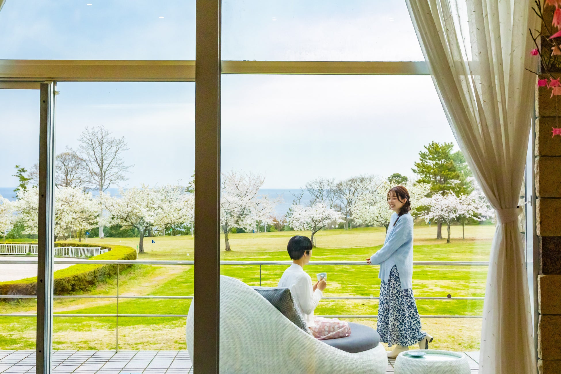 休暇村越前三国は越前加賀海岸国定公園内に位置しており、雄大な日本海が広がり思わず息をのむほどの絶景が目の前に広がっています。「この絶景をこの場所で楽しんでいただきたい。」そんな思いから、休暇村の「絶景空間プロジェクト」のひとつとして「夕陽と桜のテラス」ができました。