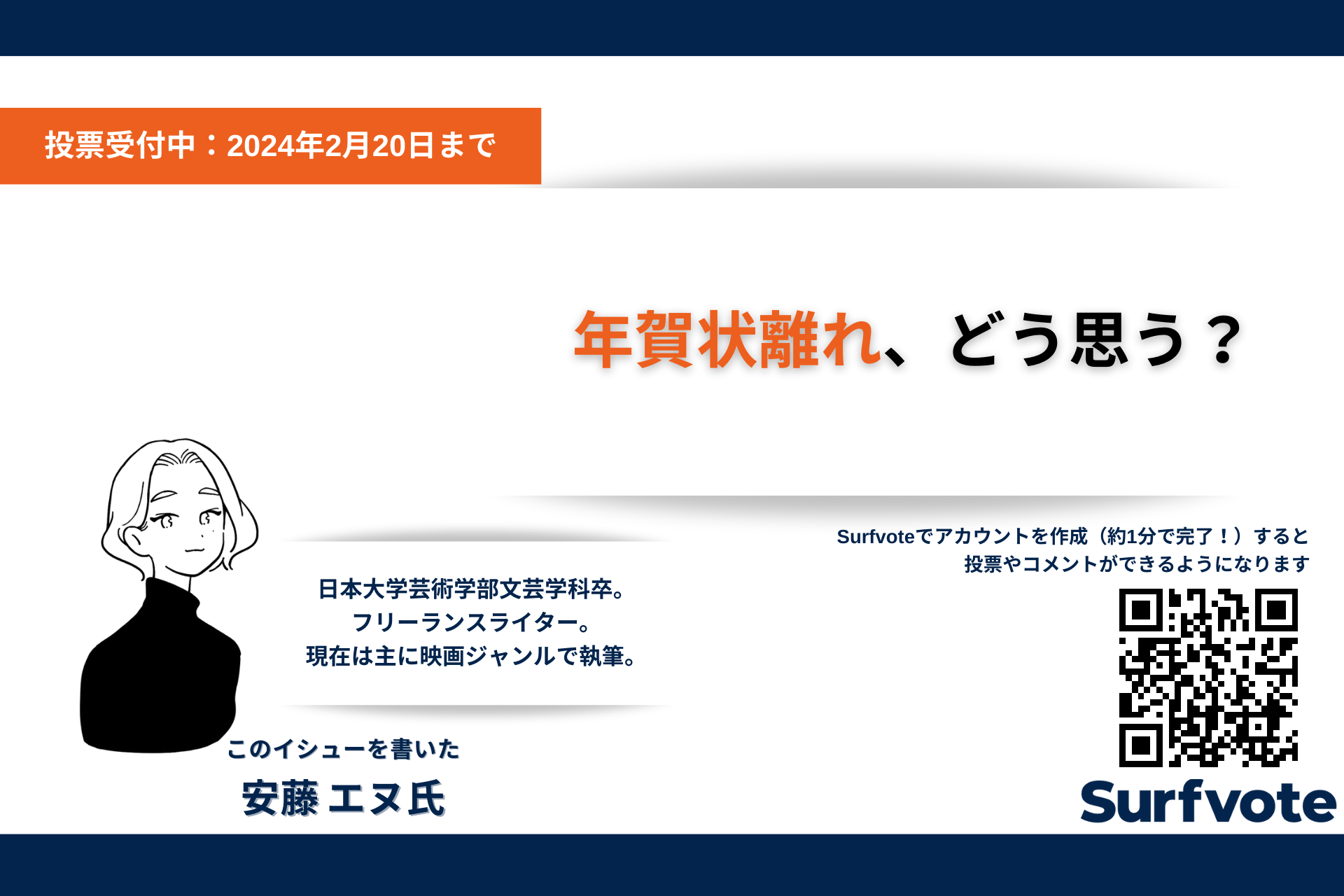 その一方でとある調査では、回答者の半数以上が「年々年賀状を書く枚数が減っている」と回答しながらも、「もらったら嬉しい」という意見も。古くから慣習として親しまれてきた年賀状、衰退していることにどう感じるか?広く意見を募集している。イシューはこちら:https://surfvote.com/issues/9clwau8d4jm8