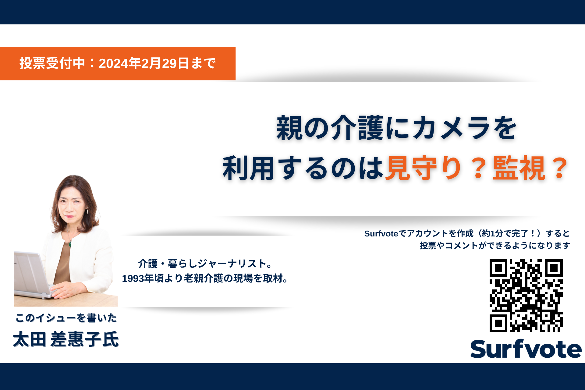 年老いた親の1人暮らしや2人暮らし。同居していても仕事などで家を空けている間、「倒れていないか」と心配になることも多いかもしれない。そんな不安を軽減するツールの一つとして、「カメラ」がある。1人暮らしの孤立死が増加傾向にある昨今、介護用のカメラを自宅に設置し子どもが「見守る」ことができることで注目されてきている。カメラでの「見守り」は子どもが簡単に親の様子を見ることができる点や熱中症予防など幅広いメリットがある一方で、「監視されている」と親が感じて拒否するケースもあると太田氏は指摘する。独居親を心配して介護用カメラを設置することは「見守り」か?「監視」か?広く意見を募集している。