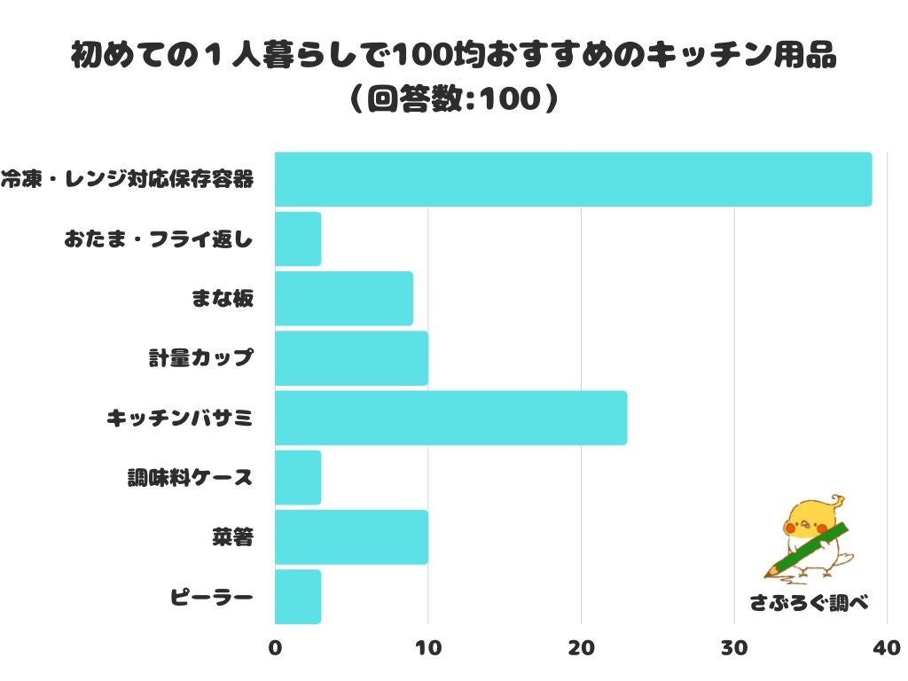 株式会社レビュー(https://jafmate.co.jp/)が運営する暮らしに役立つ情報メディア「さぶろぐ」( https://sublogg.com/ )は、日本全国の20代以上の方を対象に「初めての1人暮らしで100均おすすめのキッチン用品」についてのアンケート調査を実施しました。