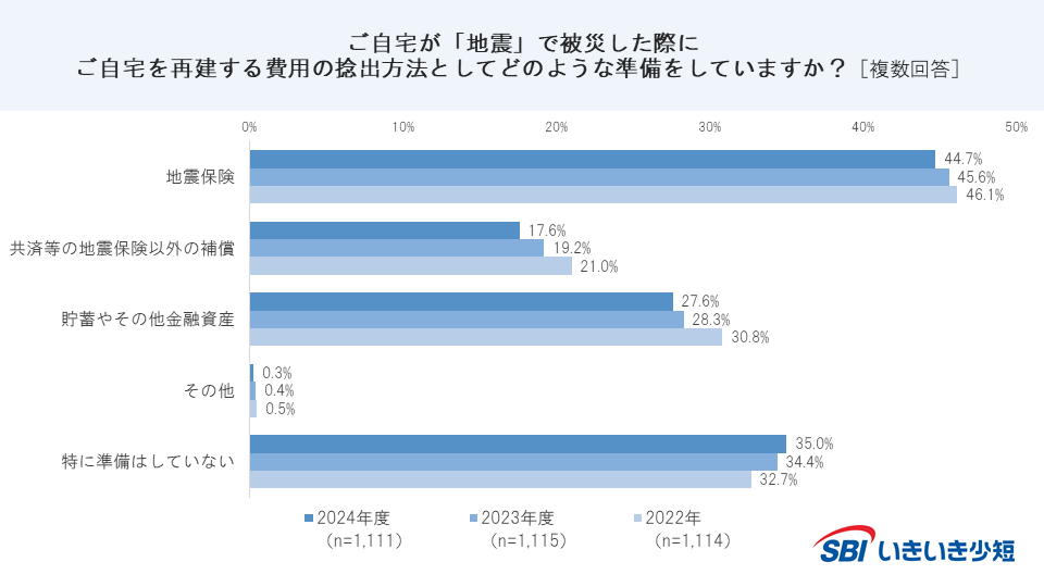 ・「地震保険(44.7%)」が最多となったが、「地震保険」を含め「共済等の地震保険以外の補償(17.6%)」「貯蓄やその他金融資産(27.6%)」すべてにおいて、準備していると回答した方が減少している。