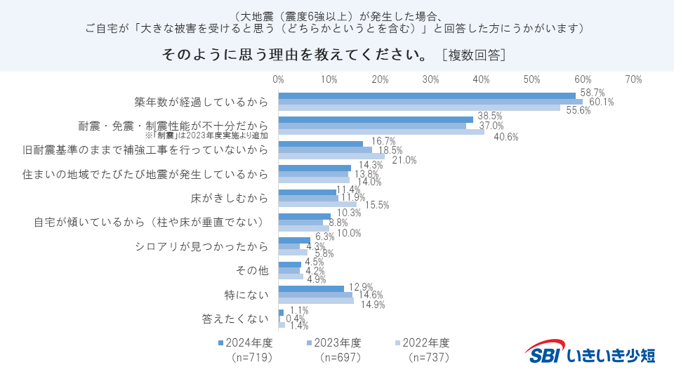 ・「大地震(震度6強以上)が発生した場合、自宅が倒壊や損傷などで被害を受けると思う(どちらかといえばを含む)(64.7%)」は、昨年より2.2ポイント上昇した。その理由は「築年数が経過しているから(58.7%)」が最多となった。