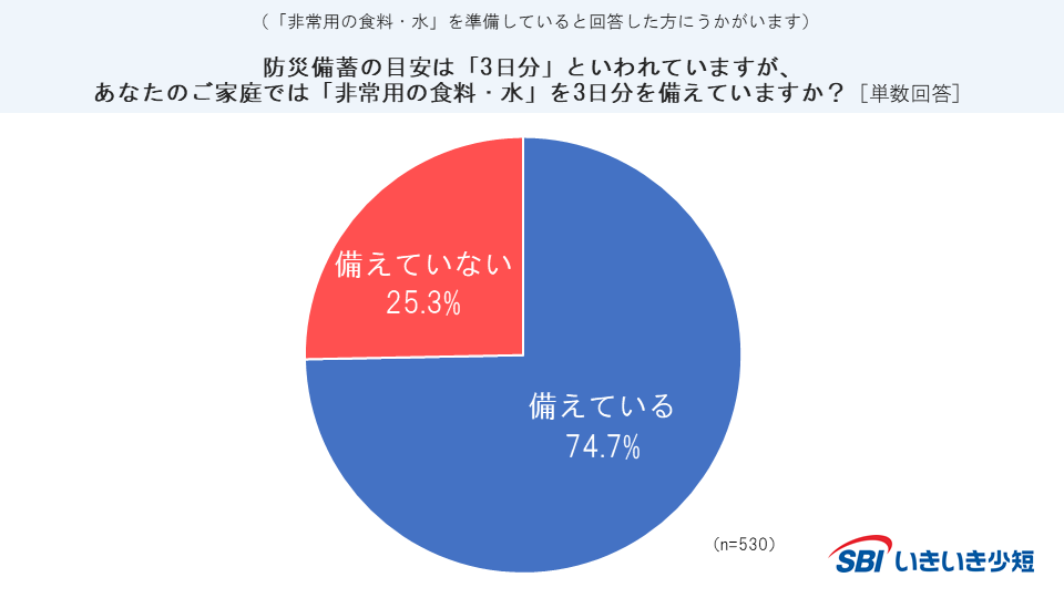しかし備蓄量の目安といわれている3日分を「備えていない」と回答した方が25.3%となった。