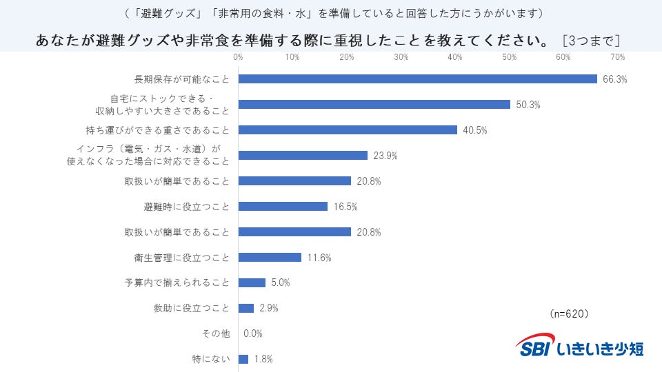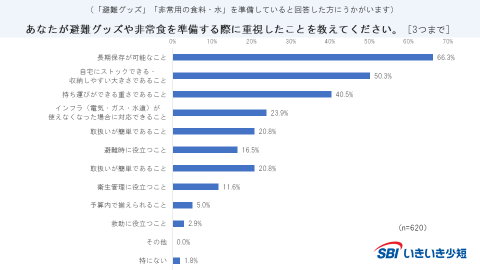 ・「避難グッズを用意している」「非常用の食料・水を準備している」と回答した方に「準備する際に重視したこと」を聞いたところ、「長期保存が可能なこと」が66.3%で最も多い。