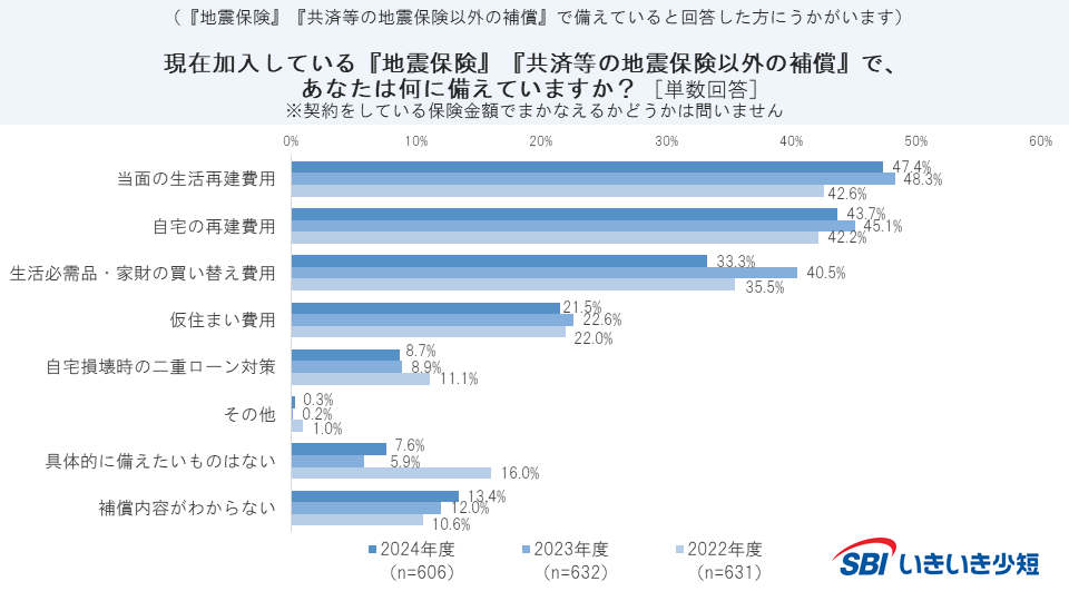 ・「当面の生活再建費用(47.4%)」が最多、次いで「自宅の再建費用(43.7%)」がともに40%超となり、再建費用に備えている傾向がみえた。