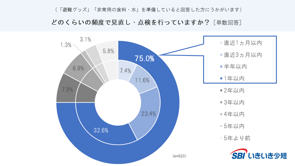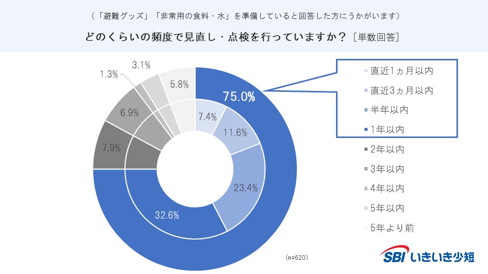 ・「非常用の食料・水を準備している」「避難グッズを用意している」と回答した方に、見直し・点検の頻度を聞いたところ、1年以内に見直しをしている方が合計で75.0%となった。
