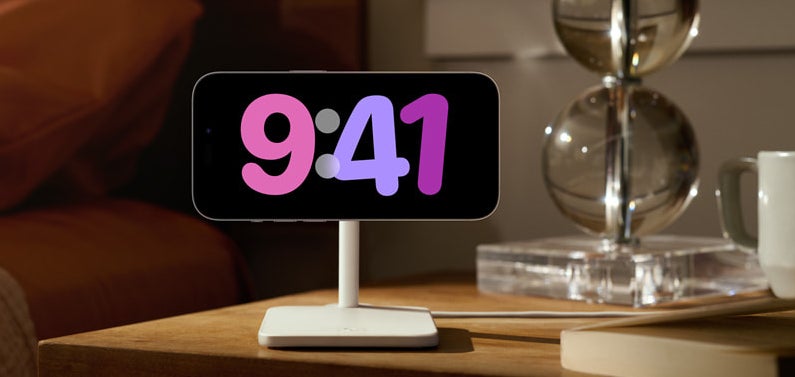 スタンバイとはiPhoneが横向きで充電されている時に離れた場所からでも一目で情報を確認できるよう、フルスクリ-ンでウィジェットを表示する機能です。写真や時計のスタイル、適切なタイミングでウィジェットを表示するスマートスタックなどを配置できます。