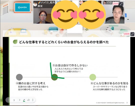投資の話は面白いし楽しいしお金も頑張れば増やせるし、投資ってすごいなって思いました。ママと今度話し合って投資プロジェクトもっとしたいです。先生の話を聞いていると活動力とかが上がって面白いです。