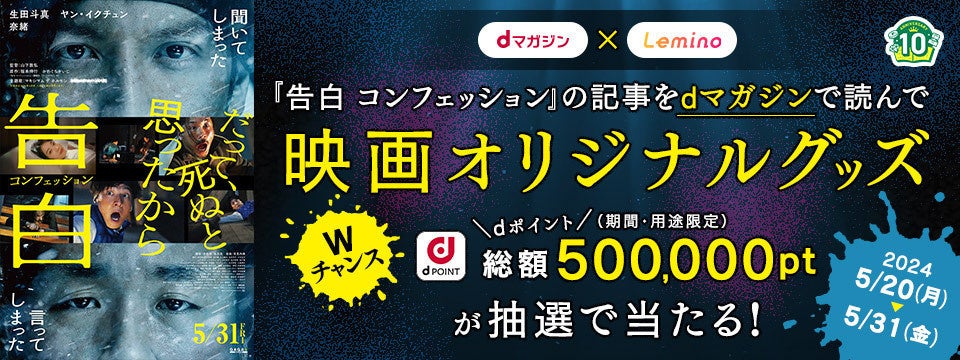 また、映画『告白 コンフェッション』公開を記念して、dマガジンでも『告白 コンフェッション』オリジナルグッズやdポイント(期間・用途限定)総額50万ポイントが当たるキャンペーンを5月31日(金)まで実施中です。
