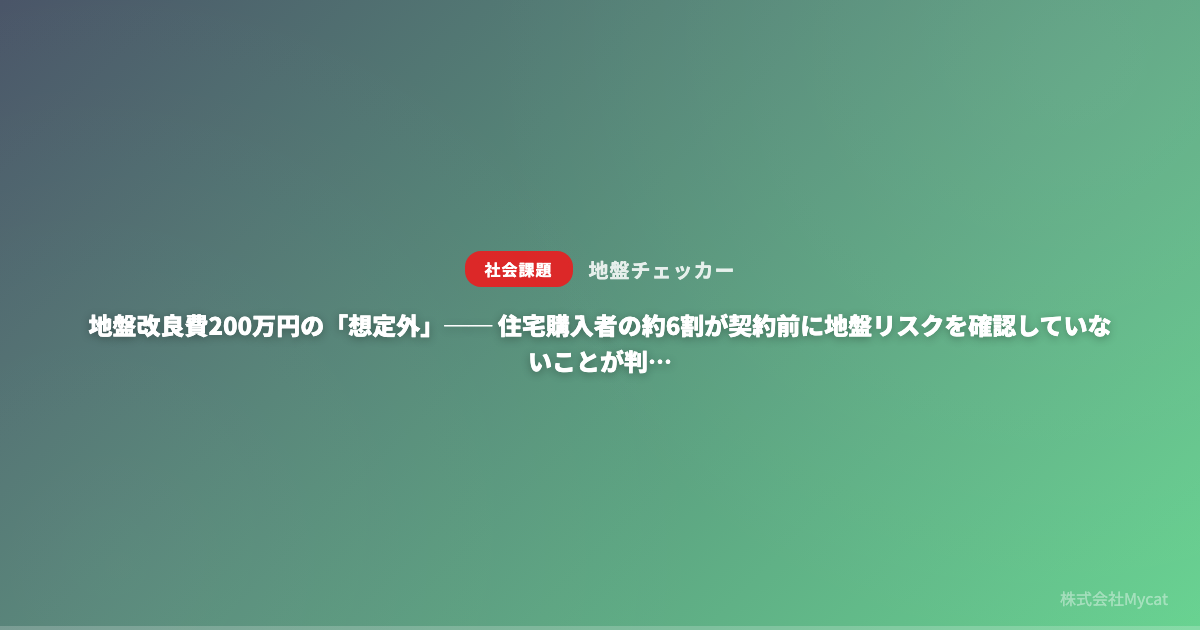 株式会社Mycatが新たに公開した「地盤チェッカー」(https://jiban.xyz)は、住所を入力するだけで周辺の地盤改良必要確率と予想費用を無料で確認できるサービスである。国土地盤情報DBのボーリングデータと照合することで、土地購入の検討段階から地盤リスクを把握できる環境を整備した。