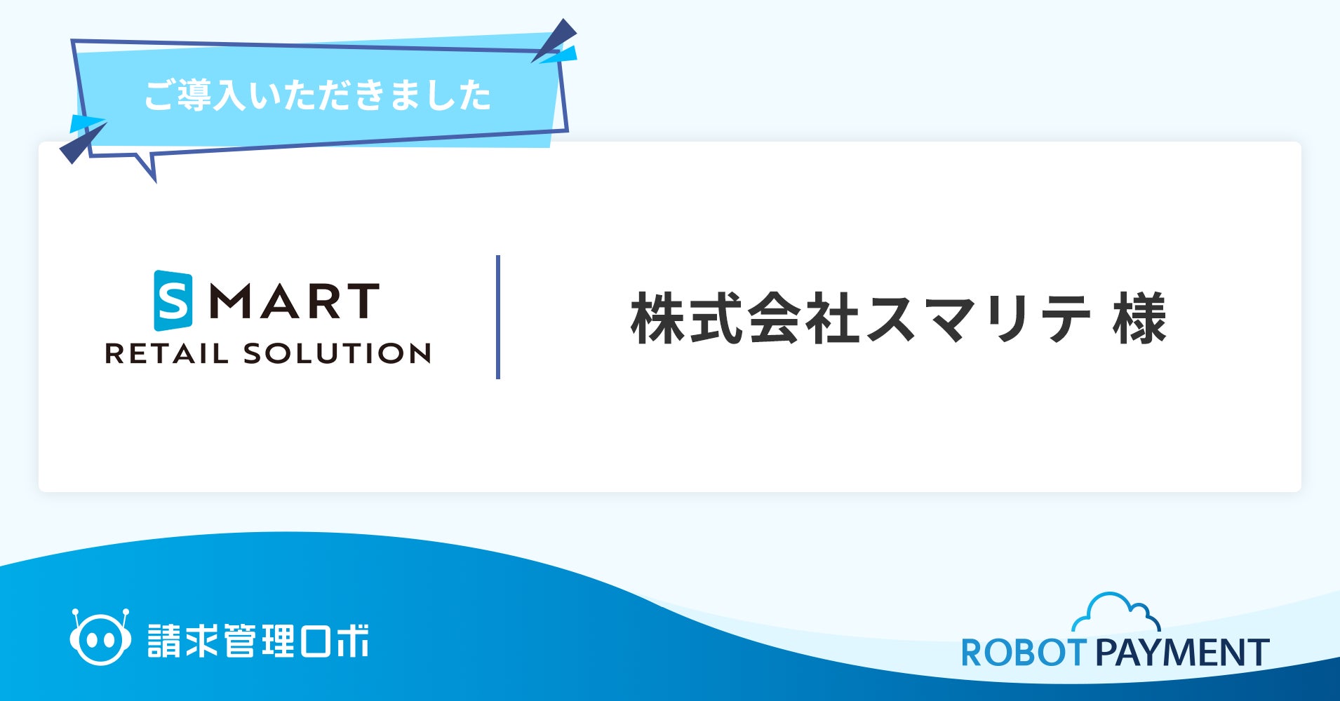 「ROBOT PAYMENT」)は、請求・債権管理クラウド「請求管理ロボ」が、国内初の無人小売基幹システム「スマリテ」を展開する株式会社スマリテ(本社:東京都中央区、代表者:金澤 秀憲、以下「スマリテ」)に導入されたことをお知らせします。