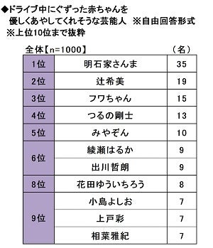ドライブ中にぐずった赤ちゃんを優しくあやしてくれそうな芸能人を聞いたところ、1位「明石家さんまさん」(35名)、2位「辻希美さん」(19名)、3位「フワちゃん」(15名)、4位「つるの剛士さん」(13名)、5位「みやぞんさん」(10名)となりました。