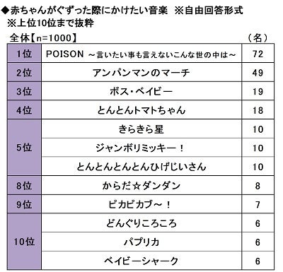 ◆赤ちゃんがぐずった際にかけたい音楽 1位「POISON 〜言いたい事も言えないこんな世の中は〜」